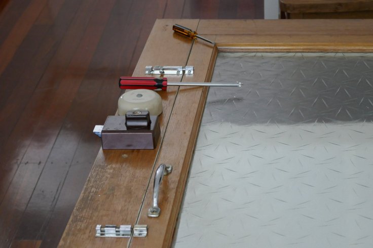 10. Ok, the door is kind of painted. Now to put all that hardware back on, and discover that of course, of course, new hardware has slightly different fixing locations. Meaning drill new holes. Which of course are a different drill bit size to every other fixing. So back to Bunnings for yet another drill bit…