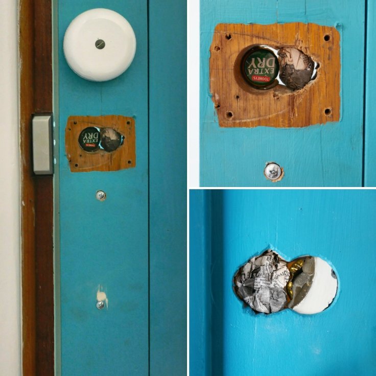 12. Ok, it’s a new weekend. We can do this! To give the door stops a break it’s time to sort out this deadbolt. Easy. Remove plaster filled beer bottle top and look for suitable replacement. An old broom handle seems just about right… Cut piece off broom handle and then sand/carve/wiggle and glue into place. Patch all around with lots of filler. Sand, paint, dry, repeat.. Nearly there!