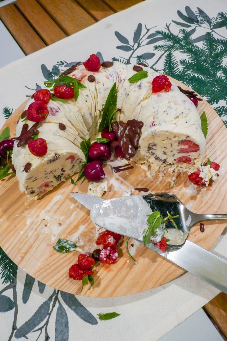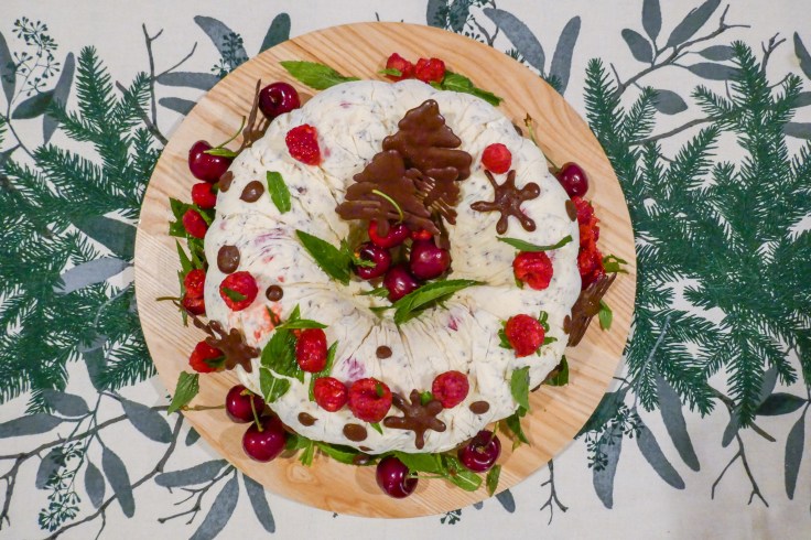 4. Spoon into a tin, or tray or bowl lined with plastic wrap, or a silicon mould. (Sometimes I do it as a loaf, but this year I did it like a wreath, in a bundt tin.) Freeze at least two hours, or overnight. Upend on to a plate and let defrost for 10 mins or so. Decorate with more raspberries, melted dark chocolate, and mint. Enjoy! Lasts at least a month in the freezer, if you can make it that far…