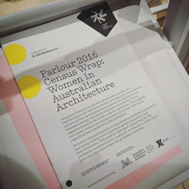 Last week I attended the Brisbane Data Salon, jointly presented by Parlour and the Gender Equity Committee Queensland. This presentation revealed the confluences and influences of gender within the architecture industry. Gill Matthewson, in her third presentation of this data, revealed the real, measured statistics on issues such as pay, working hours, leadership / ownership roles and registration rates. Information was gathered from the census, registration boards and universities to compile one of the biggest statistical studies of our industry.