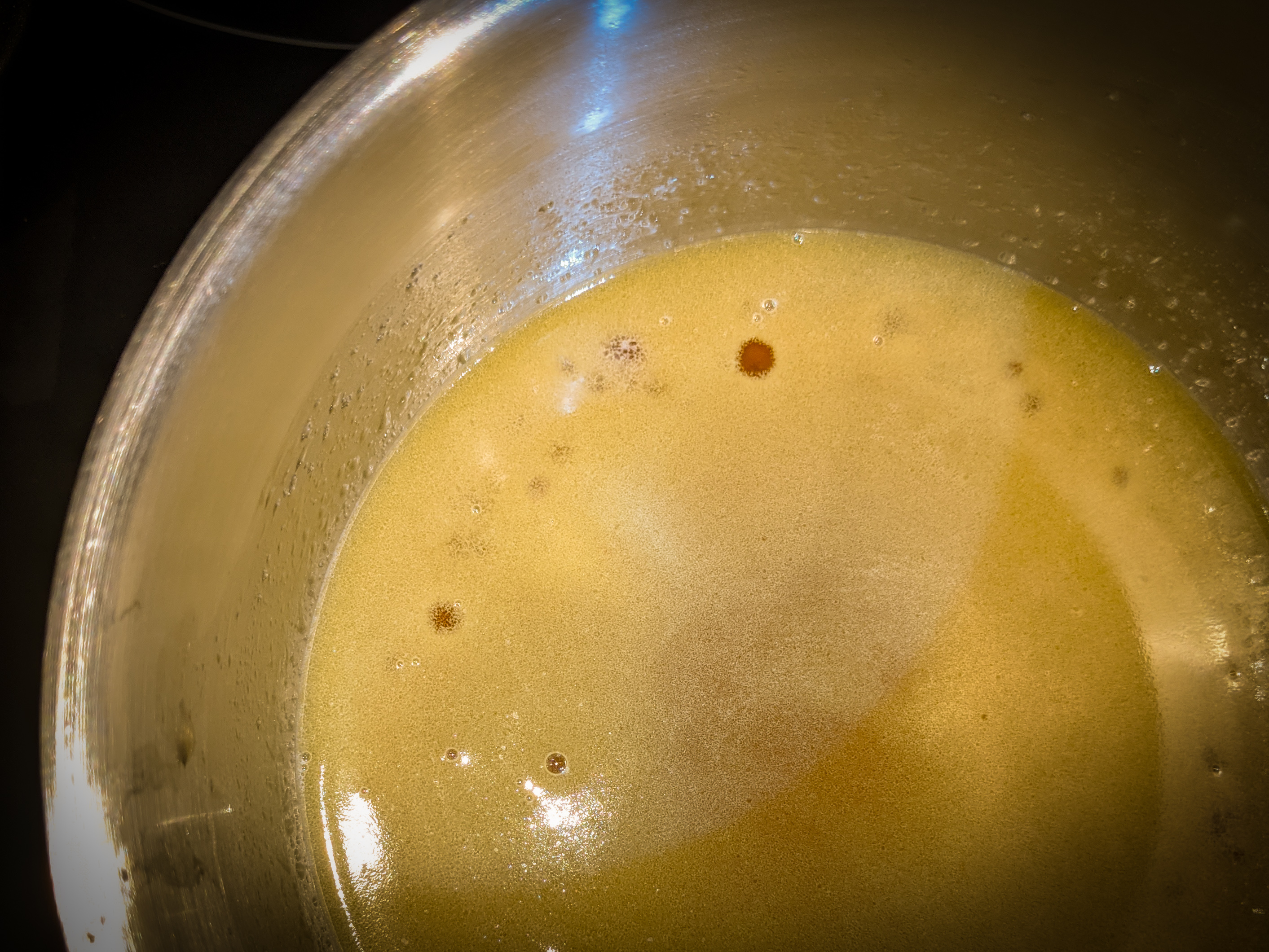 3. In a small saucepan over a medium heat, heat the sugar, butter and water until the butter is melted. (It should look light and bubbly like the picture above.) Then continue cooking for 1 more minute. Take off the heat and pour the liquid over the nuts.