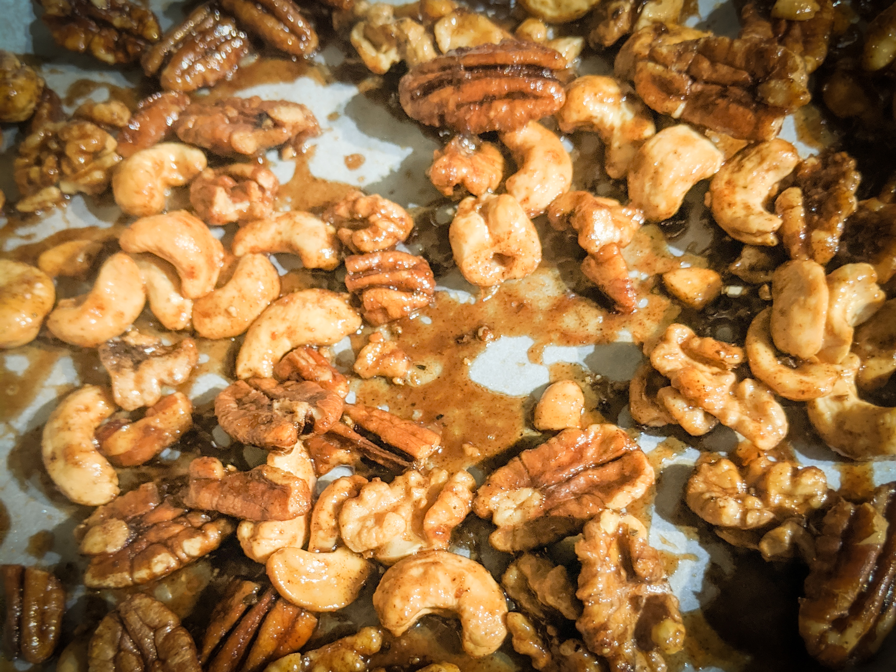 I have been trying to make spiced roasted nuts for ages, with quite a few fails. This one is still a little sweet, but the recipe is getting there! I thought I’d better write down today’s trial and error, to tweak for next time…