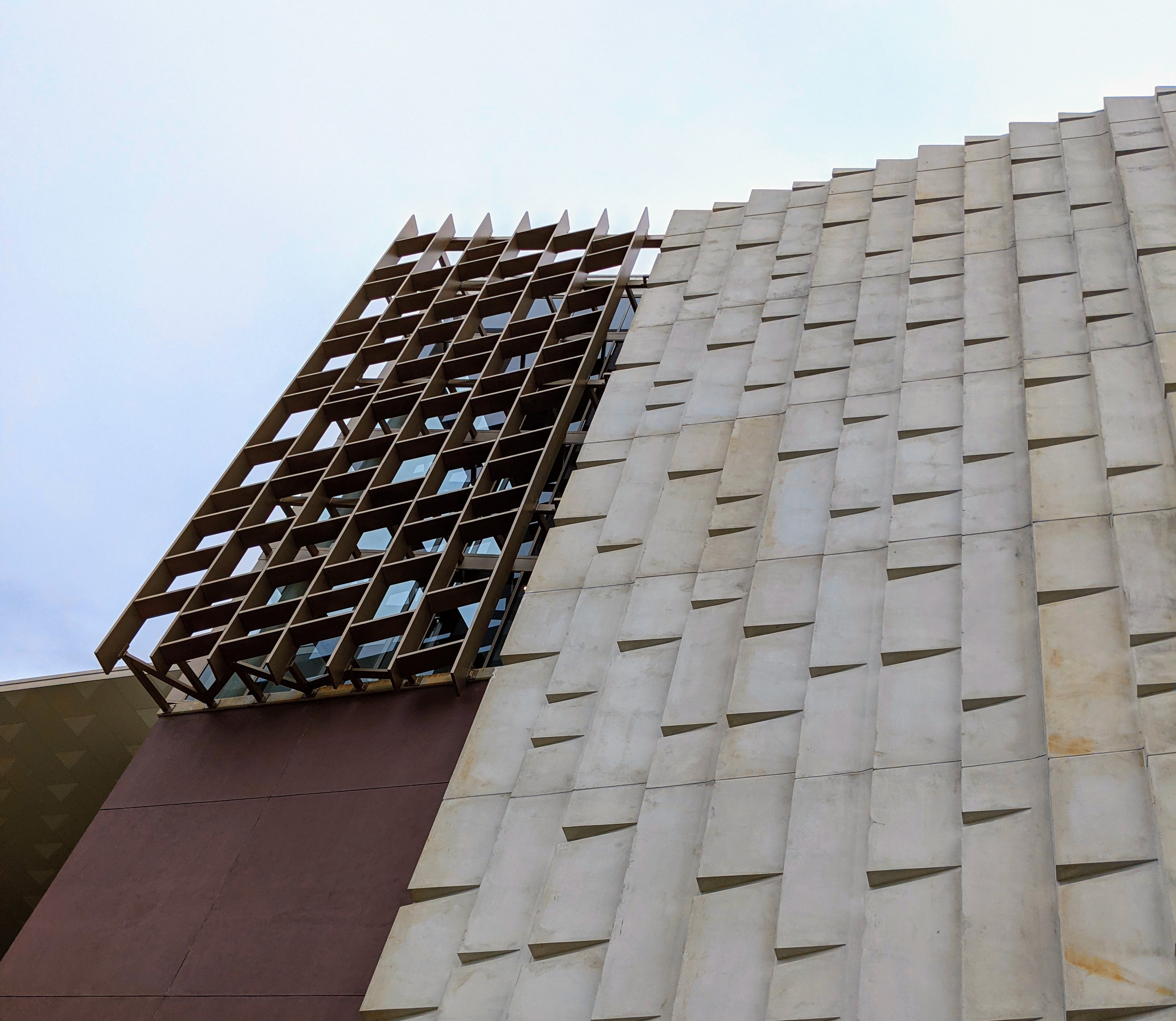 I approached the school from the nearby bus station, and it certainly makes an impact. With a bold geometric facade and a solidity of dark burgundy walls, the large extent of the school, coupled with its bold appearance celebrates learning as a beacon for the community, and forms links across to the university district and EcoSciences building.