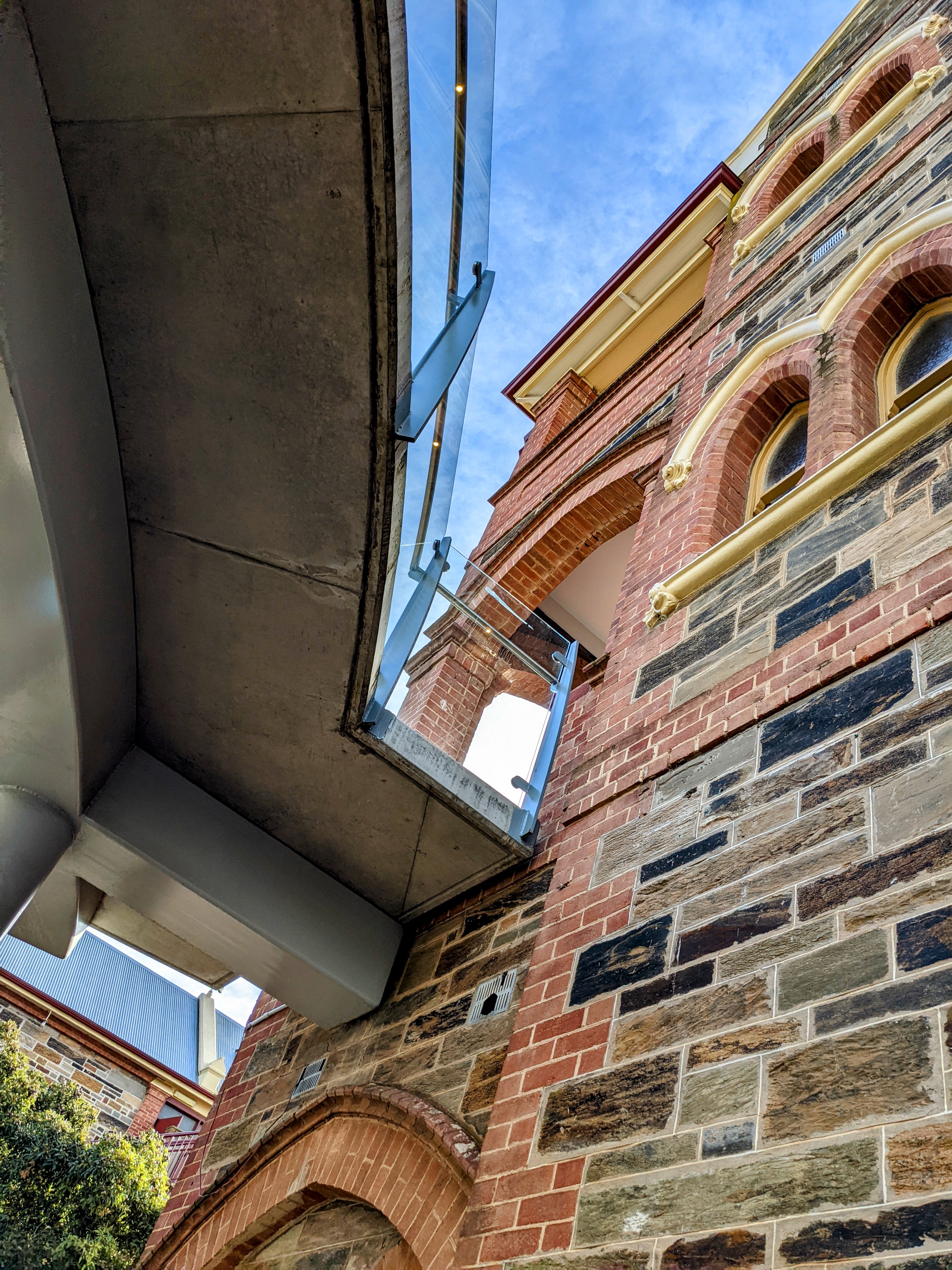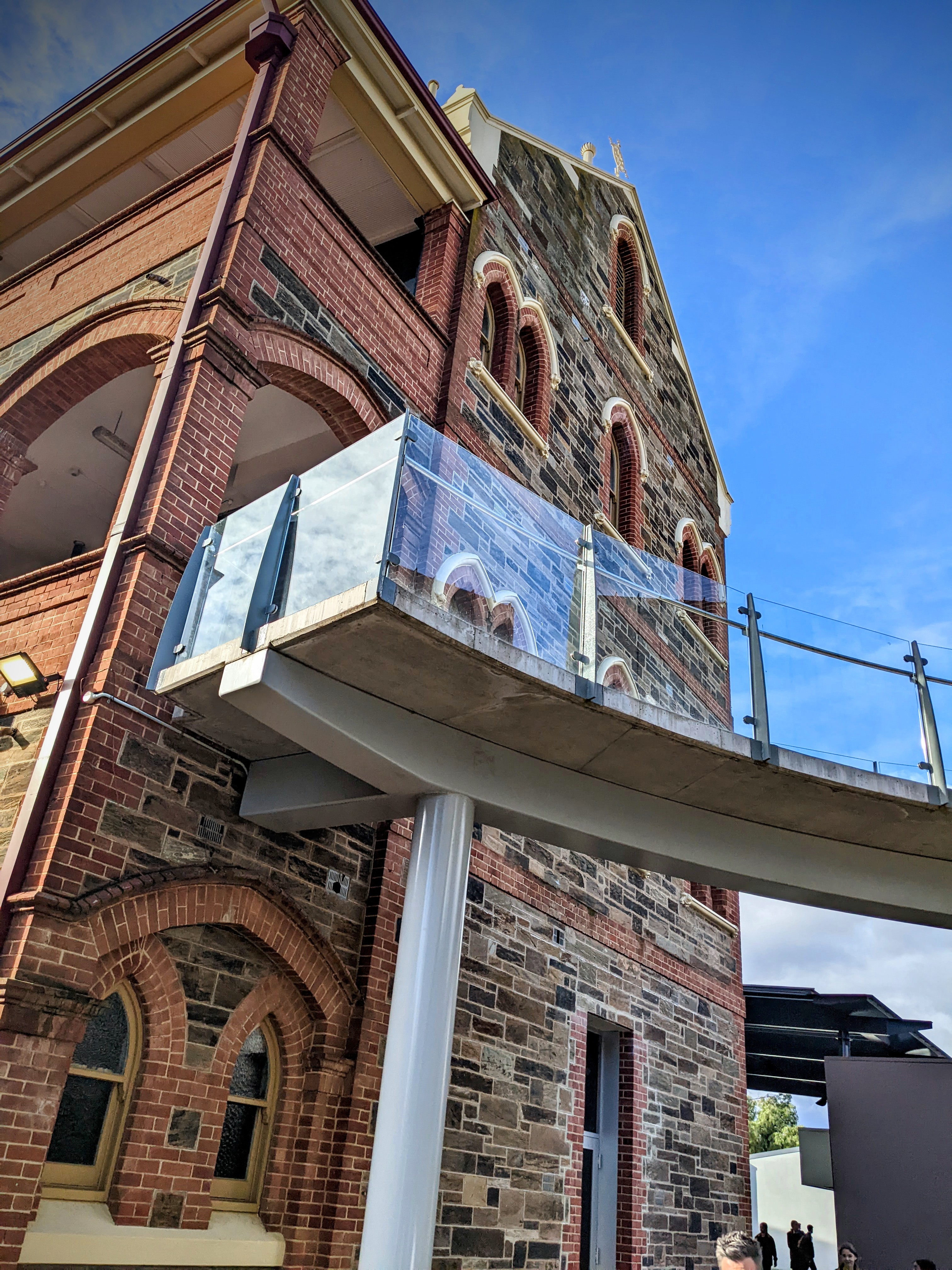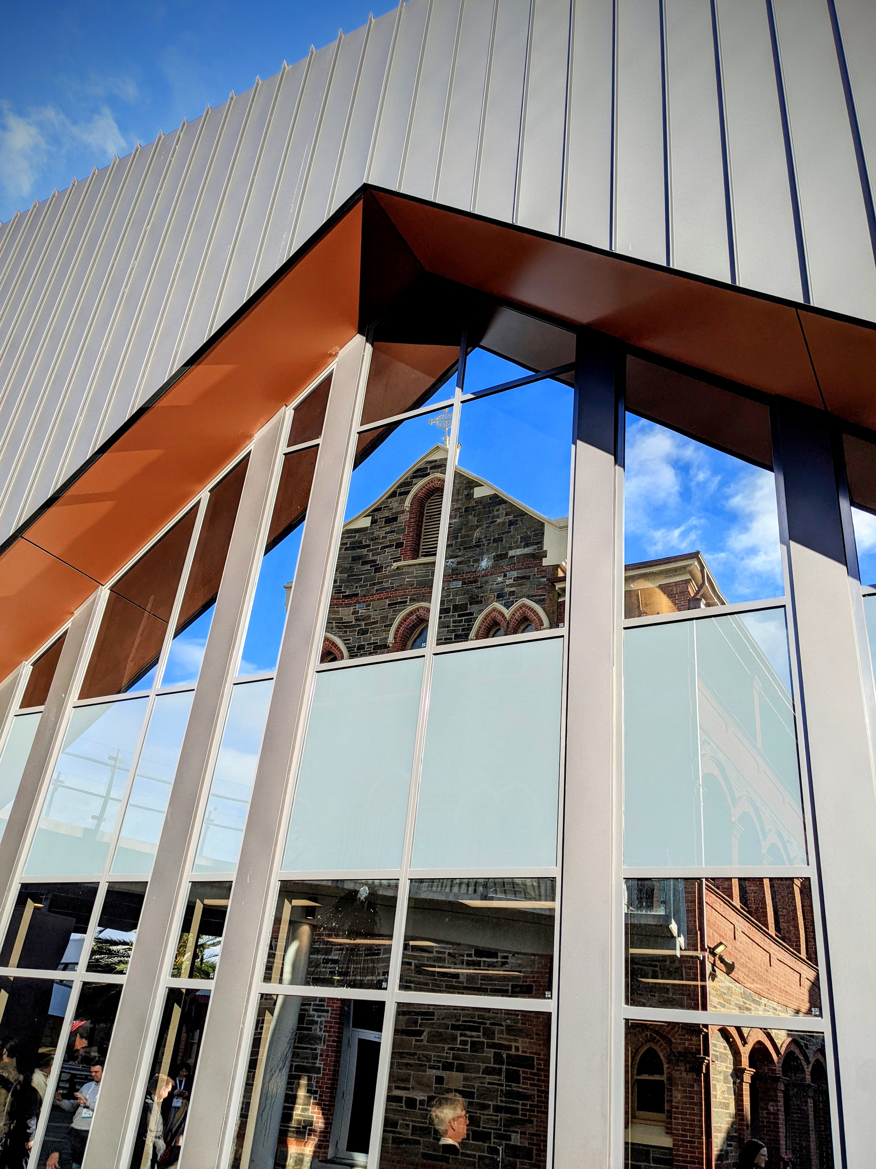 After some fantastic workshops learning about how we can better integrate the 2015 Sustainable Development Goals into our schools and learning a new phrase, heuragogy via Jacque and Lori from Cognition Education (which will probably need a whole nother article of its own), I was lucky to head off to three site visits in the inner south of Adelaide. First up we visited Cabra Dominican College, where a new jewel-like Music Centre designed by Russell & Yelland provides a linkage point between a range of multi-leveled buildings on site, and reflects the College’s history with a mirrored wall positioned opposite their heritage-listed convent building. The new building cleverly linked across to the heritage building, near-kissing the traditional stone and brick façade. On the other side of the campus we discovered the College’s new arts and technology precinct currently under construction, which looks like it is going to be a wonderful additional to the learning opportunities on site.