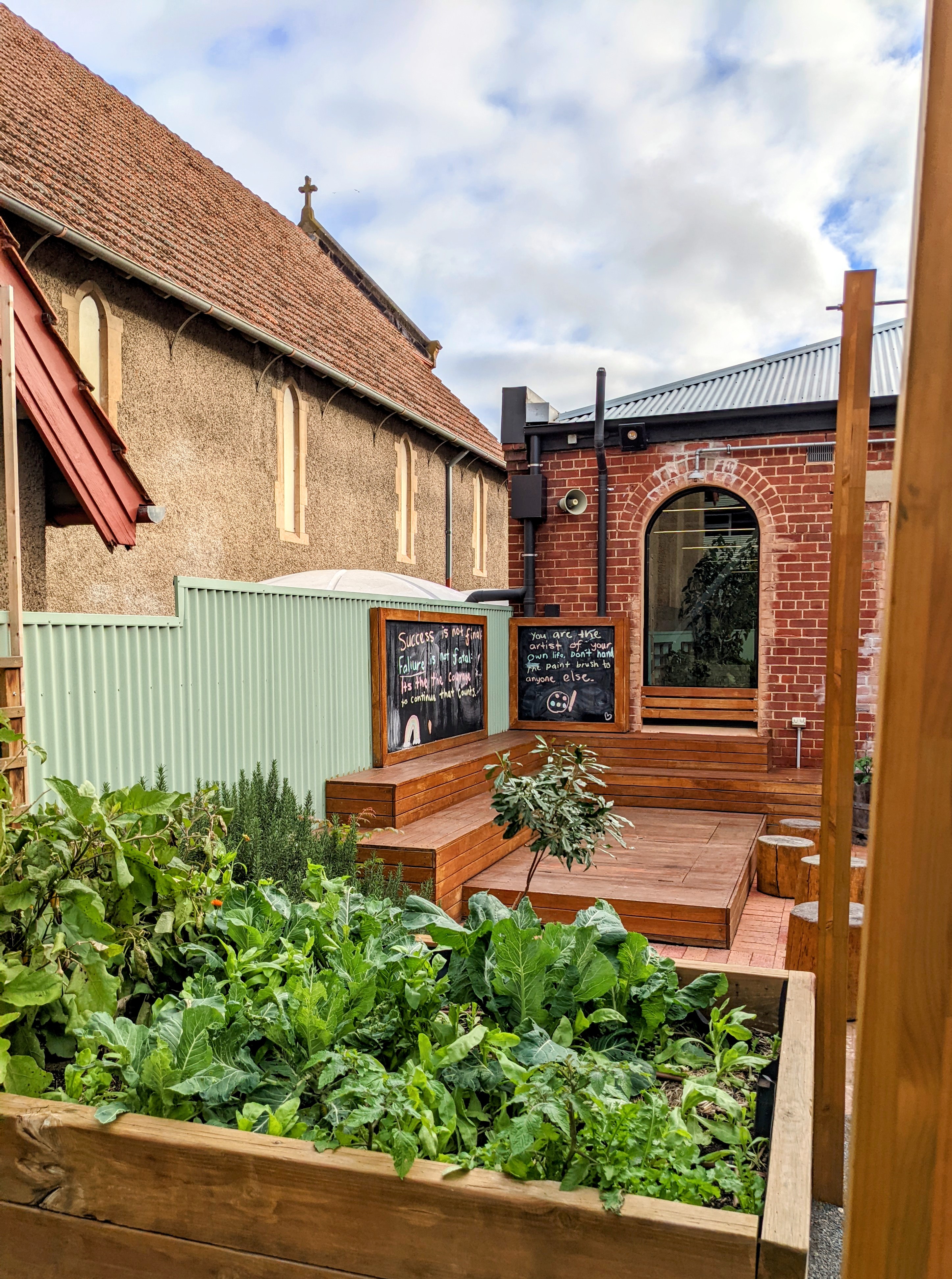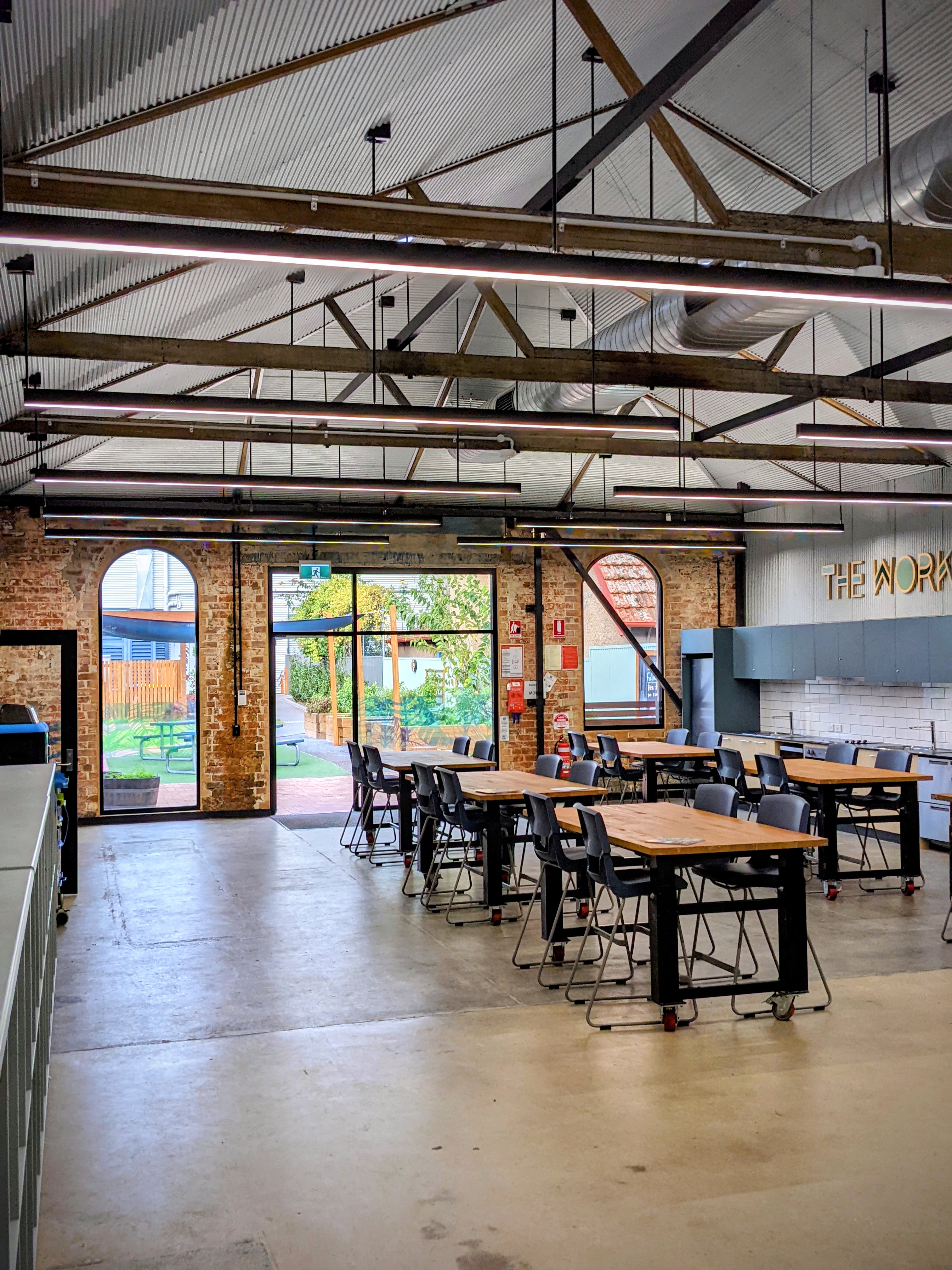 Our second site visit to St Thomas School was incredibly impressive. Nestled perfectly within a small main-street shopfront conversion of an old sign printing shop and former mechanical workshop, Grieve Gillett Andersen have created a lovely senior learning precinct for their Year 5 and 6 students, featuring both general and specialist learning settings for a range of activities. Entering from the street front, the spaces were a surprise from the busy street, completely hidden behind their film-covered glazed windows. The finishes, retaining the existing red brick, steel beams and concrete floor, set off the modern spaces in a beautifully detailed fashion. Each general learning space was on the street front side with borrowed light from the busy road, and each contained a clear glazed studio pod. The remainder of the two workshop spaces contained a multipurpose room (affectionally called The Dance Hall, based on a previous use), and an incredible workshop space with wet areas, kitchen spaces, flexible furniture and very neat moveable storage solutions. This large workshop lead out onto a beautifully landscaped garden space, which our student guides appreciatively led us through, telling us about their worms and their plan for chickens coming soon.