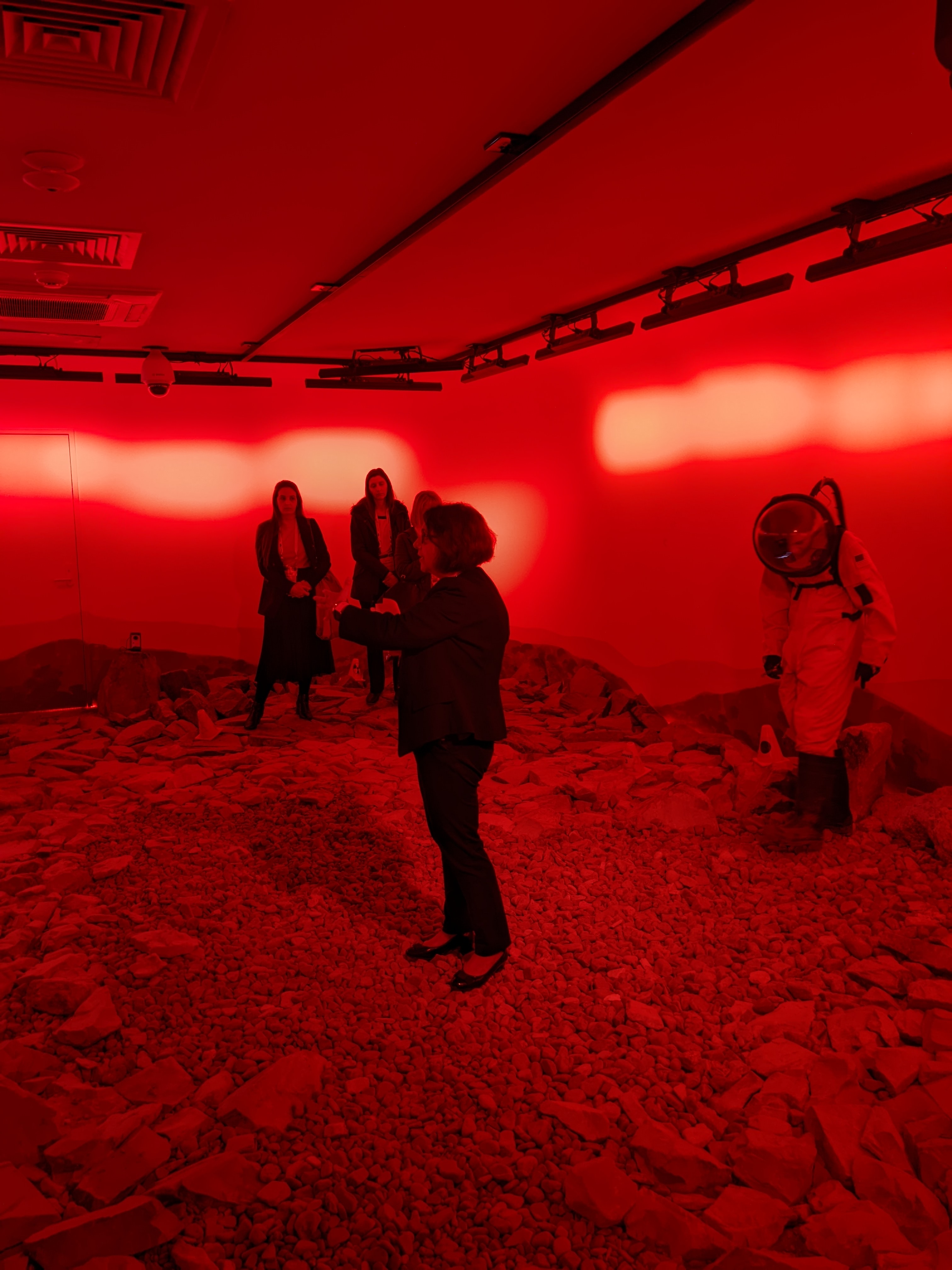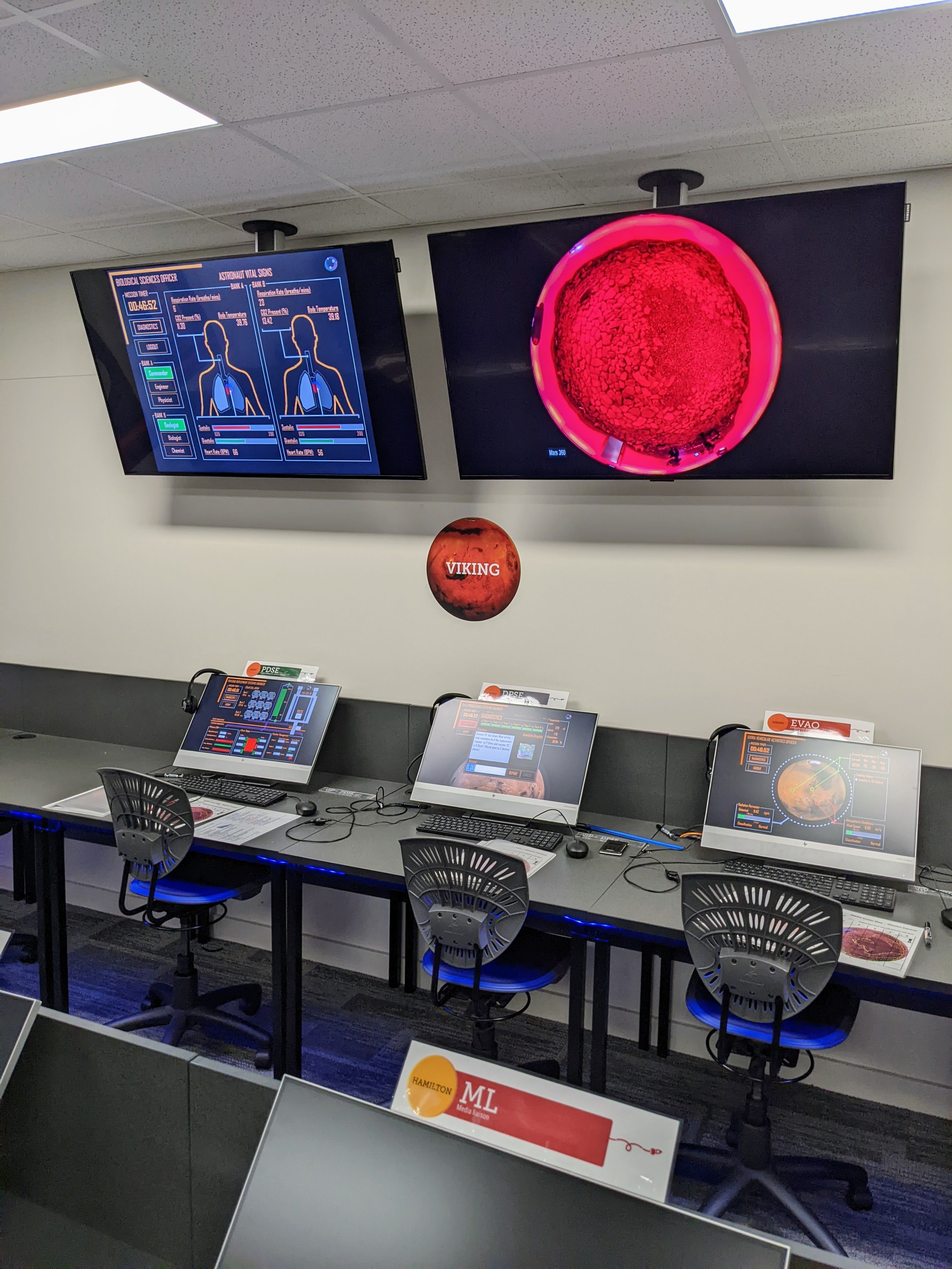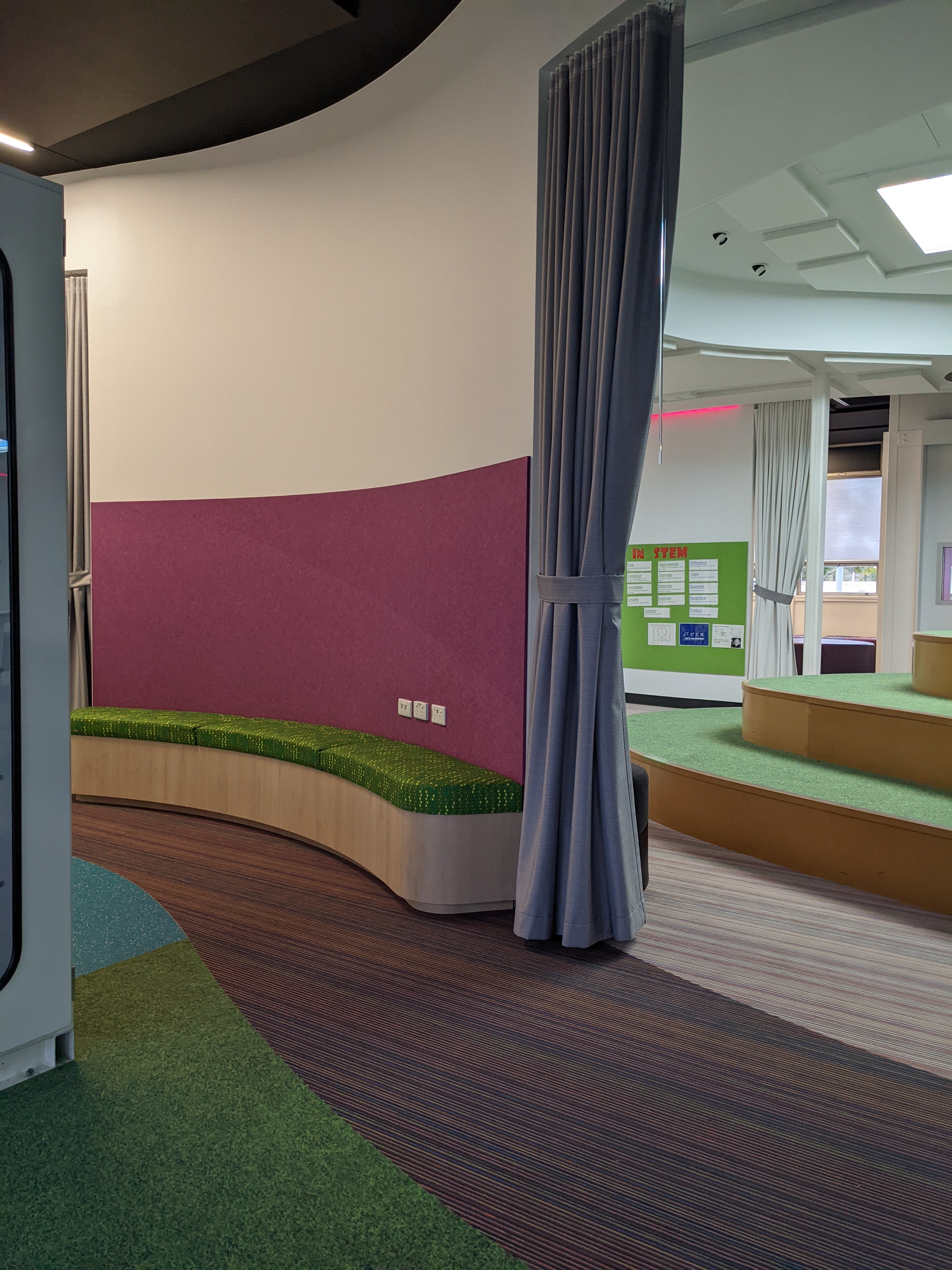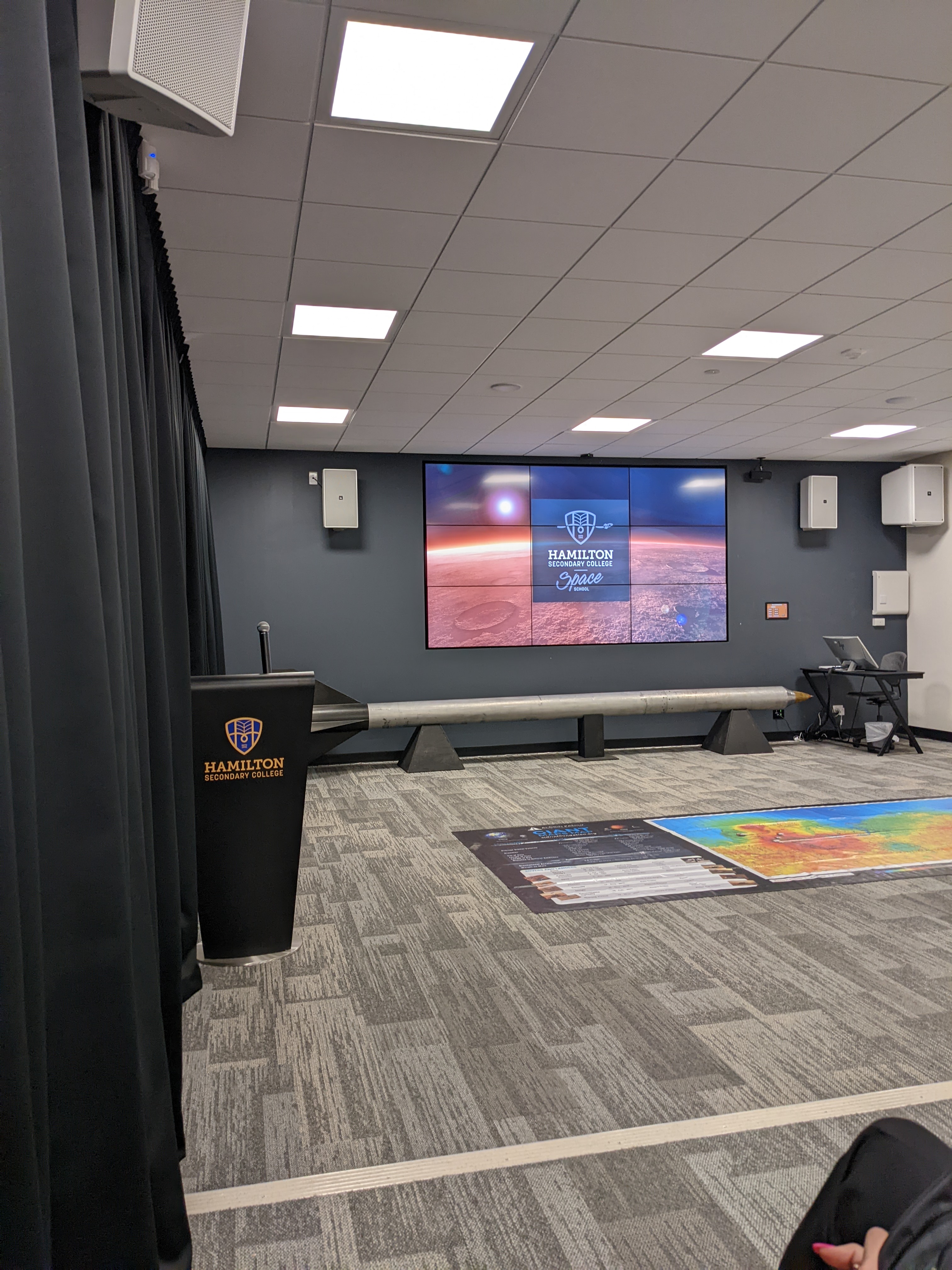 I have never seen anything like what we discovered at Hamilton Secondary School. Set unassumedly amongst what we thought were standard classroom buildings we suddenly found ourselves plunged into a journey from Earth to Mars. Our first room was set up as a briefing room, before we headed to Mission Control where students were working together with their teammates on ‘Mars’ as they searched for life on the Red Planet. Large screens monitored their biometrics and gave feedback about the atmospheric conditions on the planet. Next we journeyed to the planet ourselves via a short corridor rather than a months long spaceship-trip. The room set up as Mars was quite extraordinary, with curved walls lit in red and a stone floor requiring the agility of a goat. Students were moving around the room taking rock samples, directed by their partners in the Mission Control room, for further diagnosis back in the lab. In terms of real world learning experience it was certainly unique, and we could see how excited the students would be in such a space, even, as we were, after school hours. Also at HSS we visited a new STEAM Centre which contained a really interesting variety of learning settings, from tiered steps, open spaces, a laser printer zone, a wet area with gas science tables and smaller kitchenettes and smaller studios. In these connected spaces up to three classes can work at their own pace exploring, researching and prototyping in any of the zones which as little or as much teacher support as required. I really liked the different methods of connections between the space, from glass sliding doors to curtains to changes of height and finishes. You could see the creativity that could result from within the spaces.