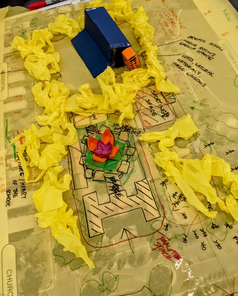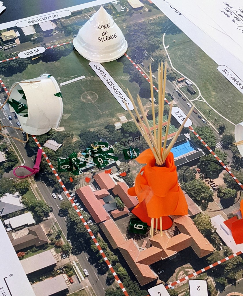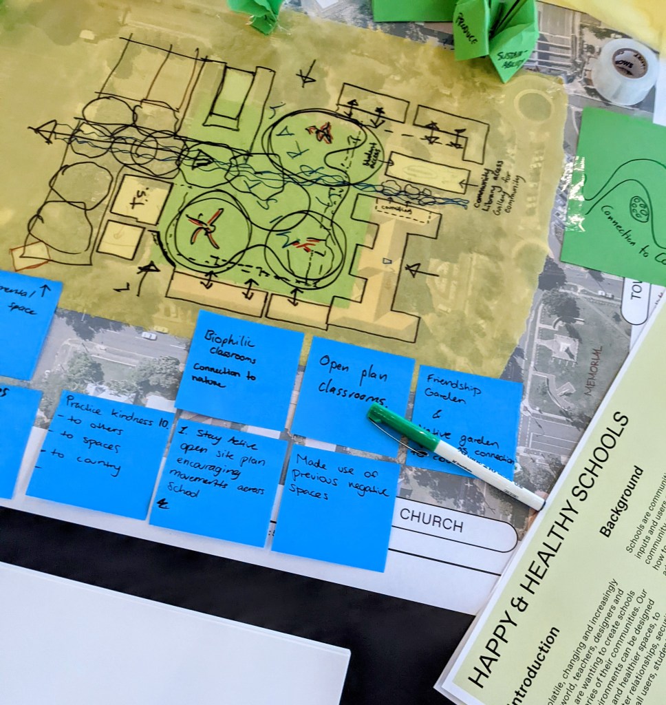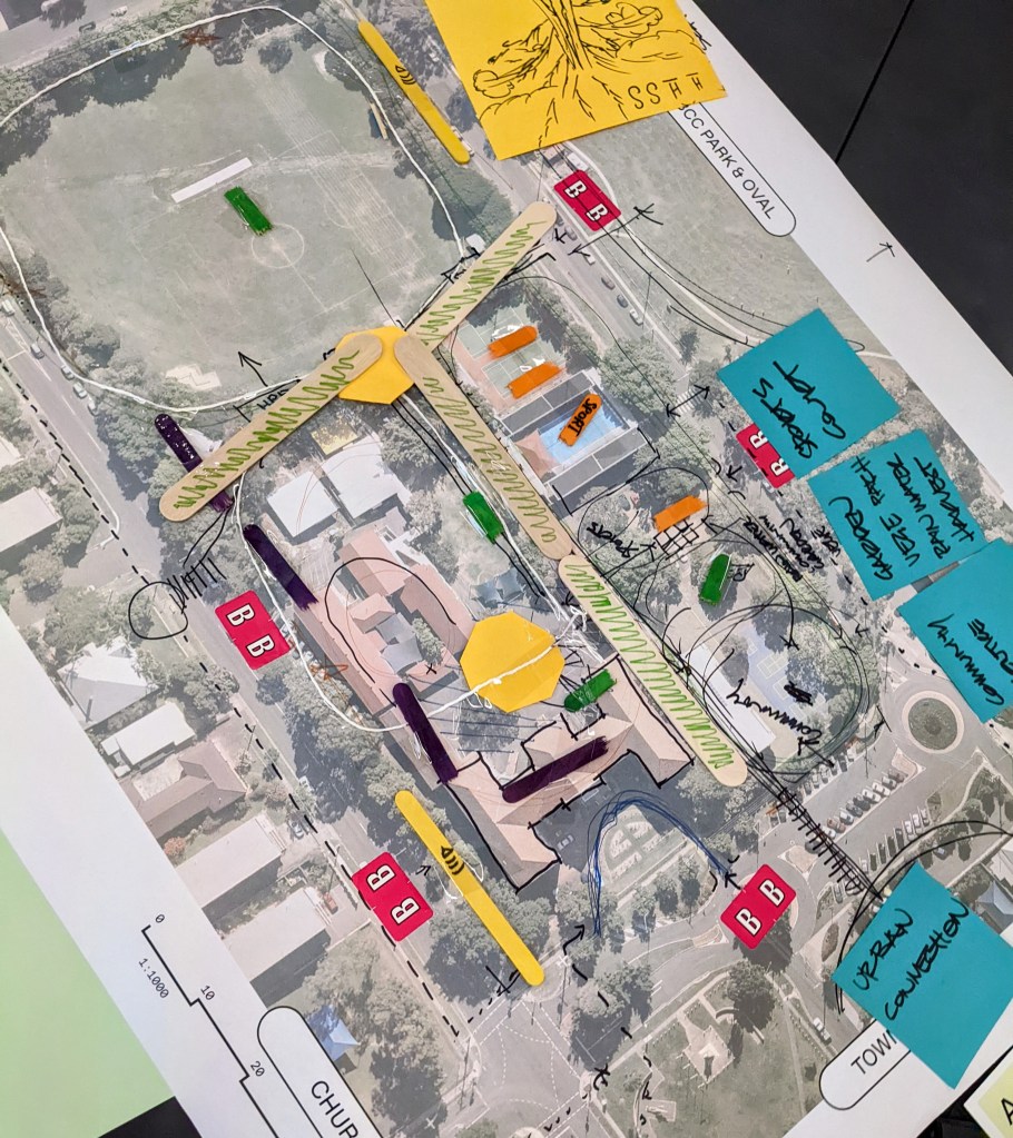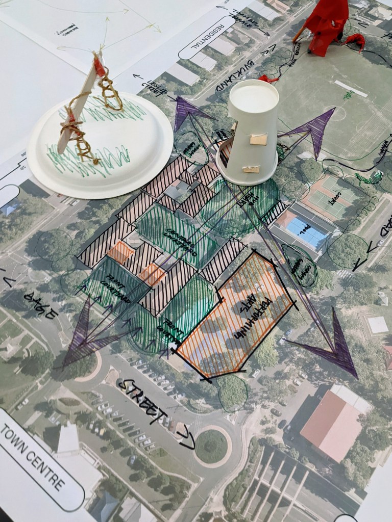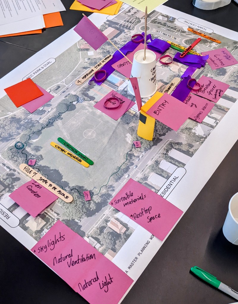 After hearing from all of our students, we got stuck into masterplanning our theoretic school site. Our first activity was to examine and understand our site better through physical and cultural analysis, incorporating aspects like spaces for people vs cars, entries / access and school heart, considering Country and connections to community. Based on this process of investigation and forming assumptions, each group named their school and it was great to see the aspirational goals shared within the names, like Heart Tree School, Connection College, Yackandandah Academy for Youth (YAY!), Healthy Heart High School and Middle Grove State School.