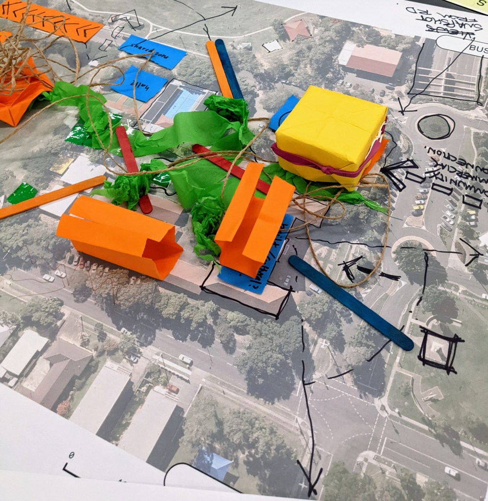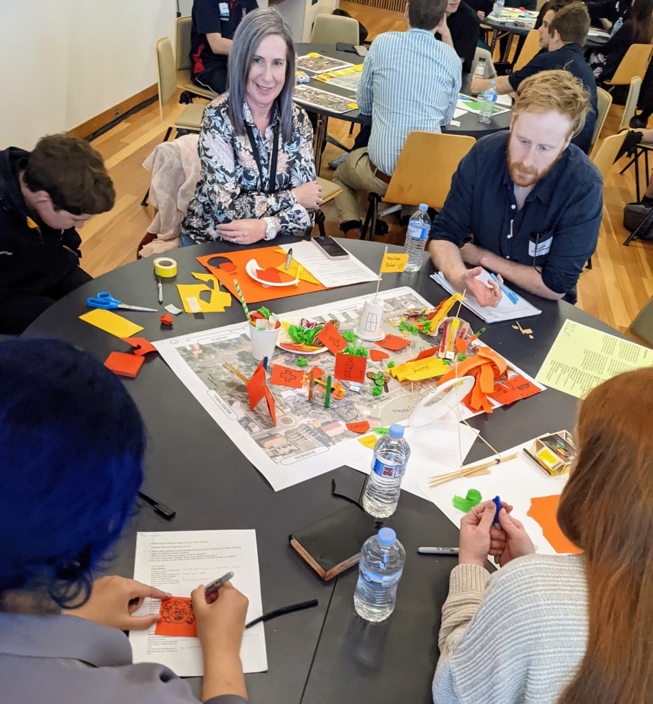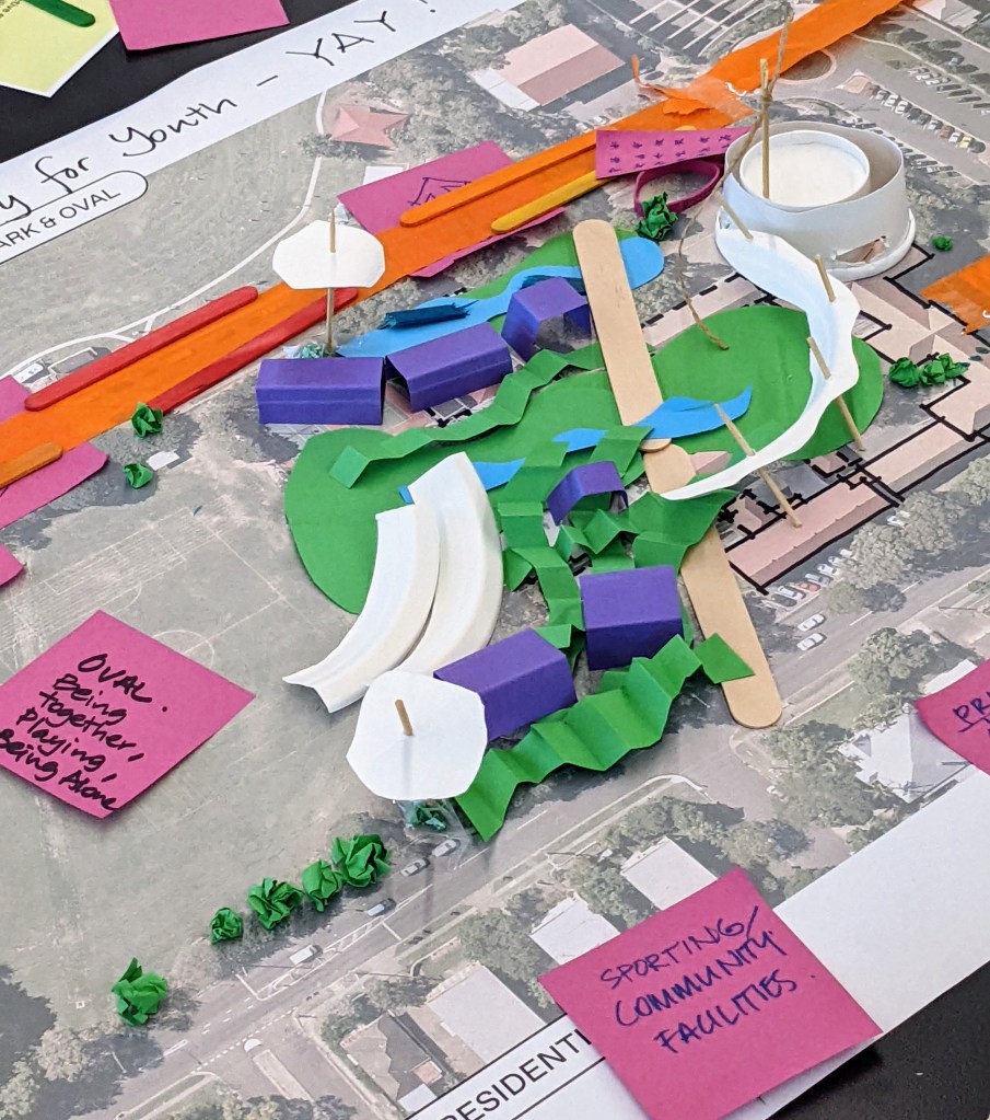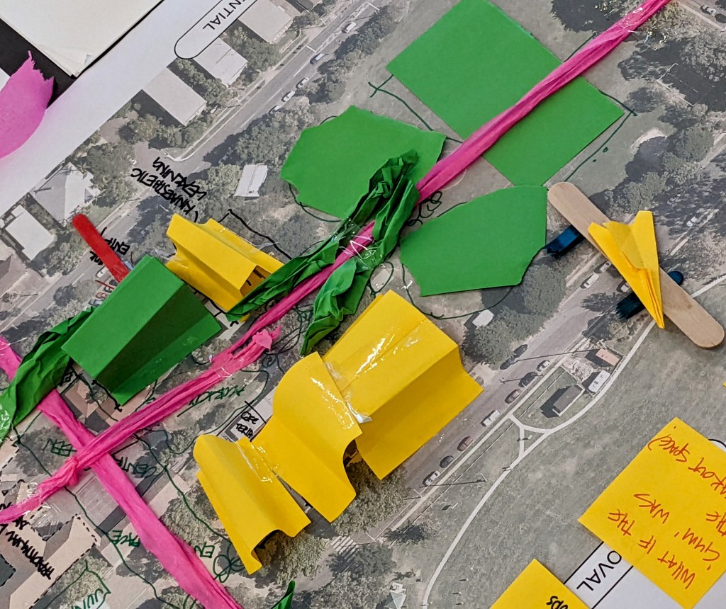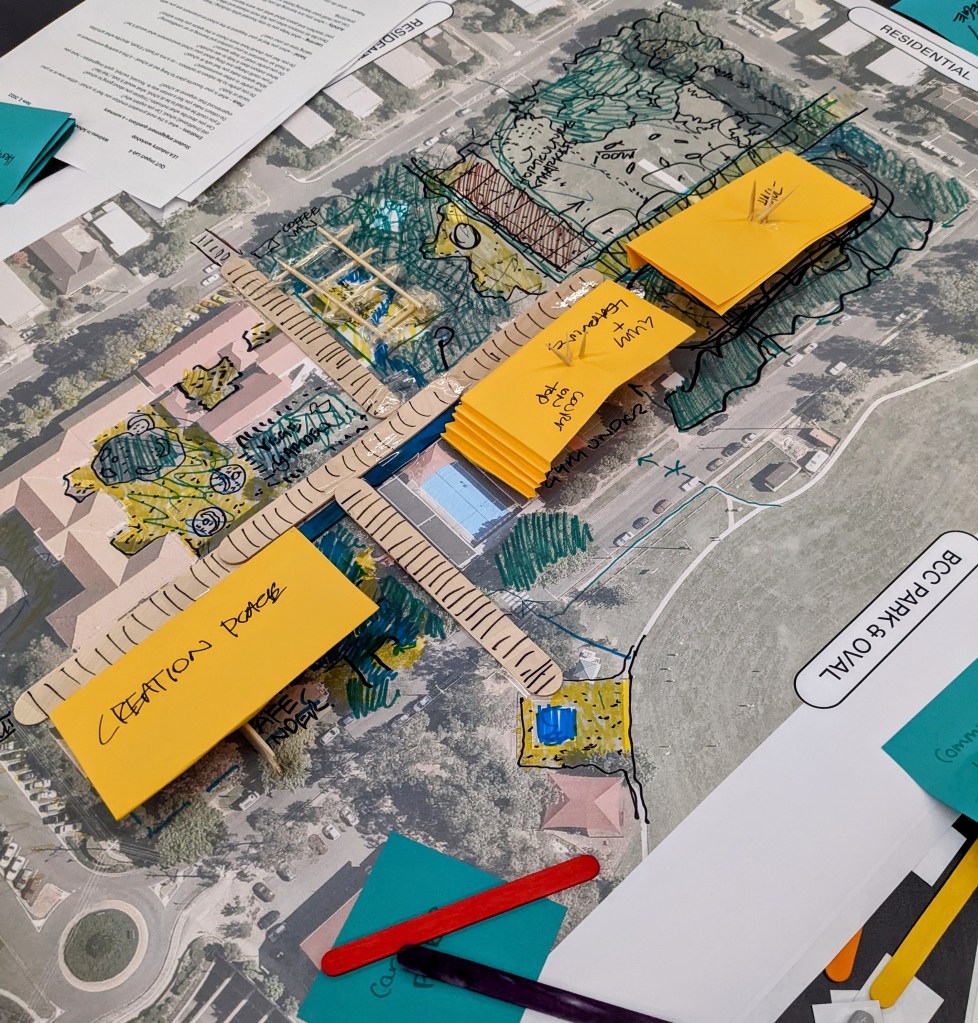 After hearing from all of our students, we got stuck into masterplanning our theoretic school site. Our first activity was to examine and understand our site better through physical and cultural analysis, incorporating aspects like spaces for people vs cars, entries / access and school heart, considering Country and connections to community. Based on this process of investigation and forming assumptions, each group named their school and it was great to see the aspirational goals shared within the names, like Heart Tree School, Connection College, Yackandandah Academy for Youth (YAY!), Healthy Heart High School and Middle Grove State School.