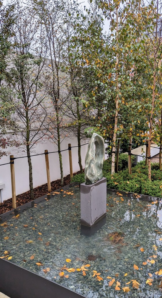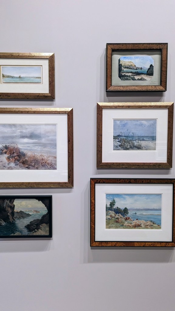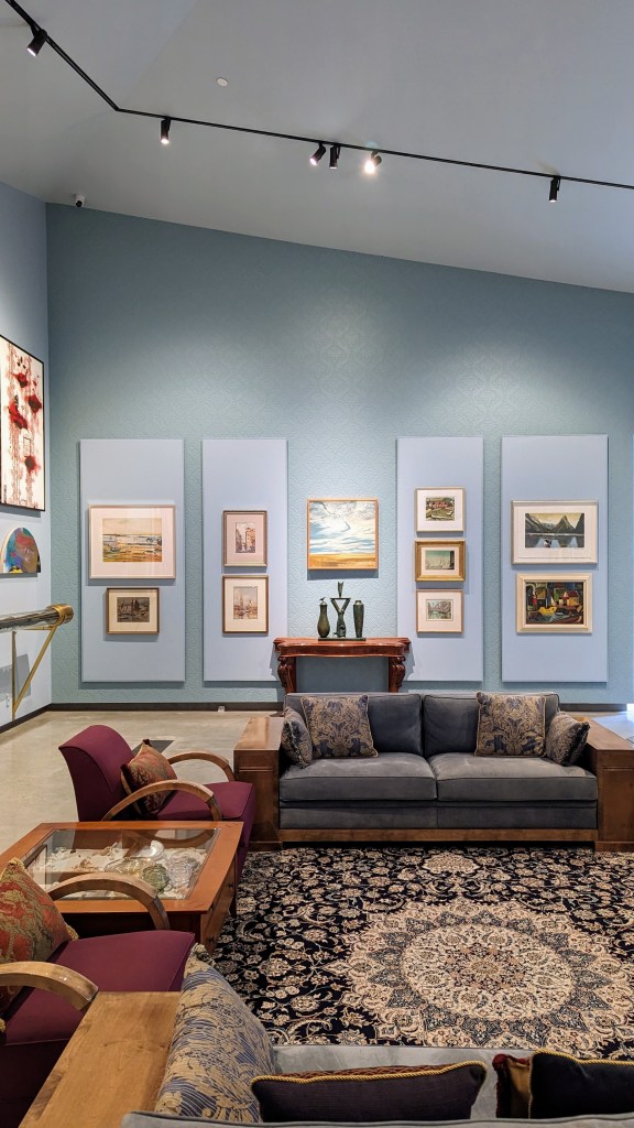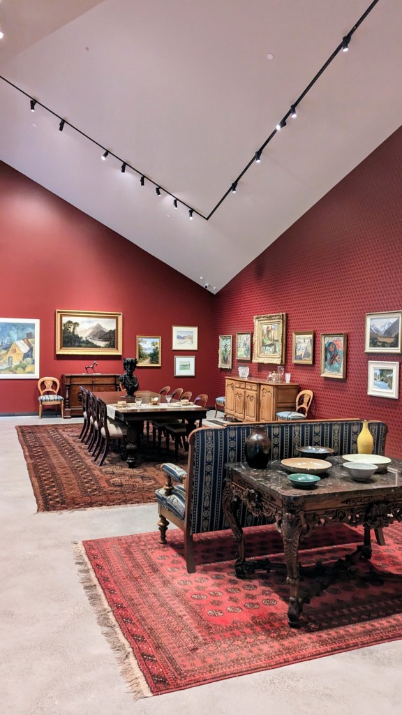 So the rooms within the building have an interesting dichotomy – they are both appreciative of their (new) site context, but also partly replicate the previous home of the impressive artworks. The first gallery space, the dining room is especially impressive in this way – you enter from a grey, glass-enclosed public foyer connected to a garden and pond and framed by grey clouds, and are suddenly transported into a grand country manor space with the most incredible collection of NZ landscapes I’ve ever seen lining one whole wall. It’s nearly overwhelming, but is somehow contemplative and joyful – all the things you hope architecture can be.
