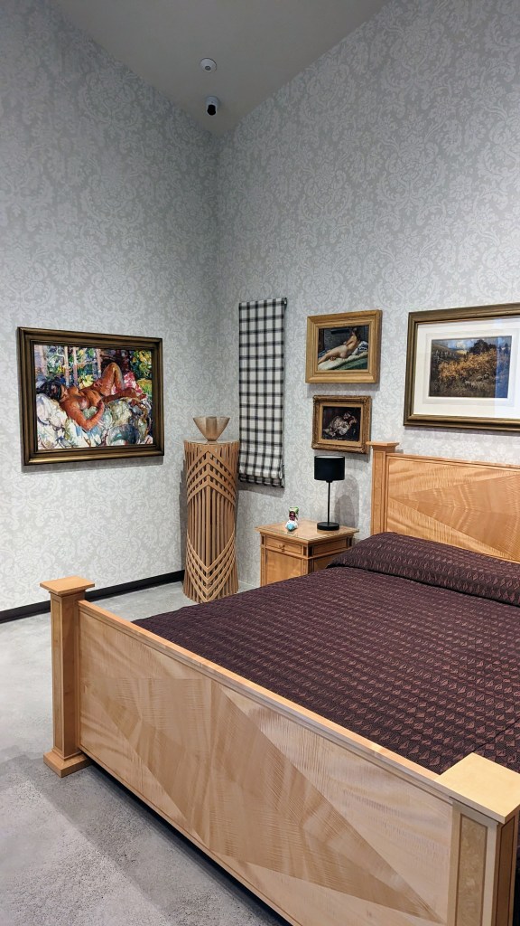 There are four main gallery spaces – the aforementioned dining room, the bedroom, the lounge room and the library, housing paintings, sculptures, an amazing collection of glassware and an equally impressive collection of books. The original door to the library, a hidden operable bookshelf that would make Agatha Christie proud, was salvaged from the original earthquake-damaged house and is now located within the new library. It’s very cool.
