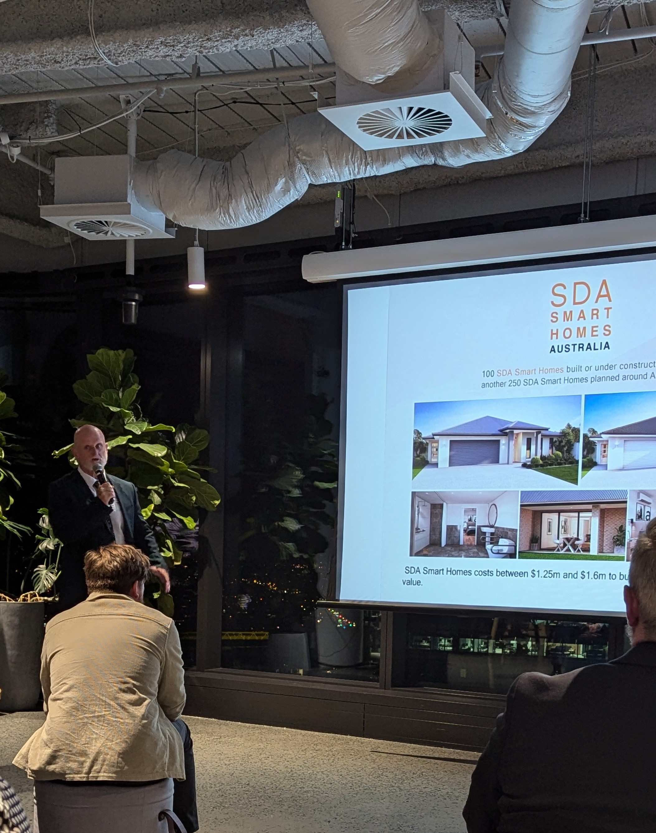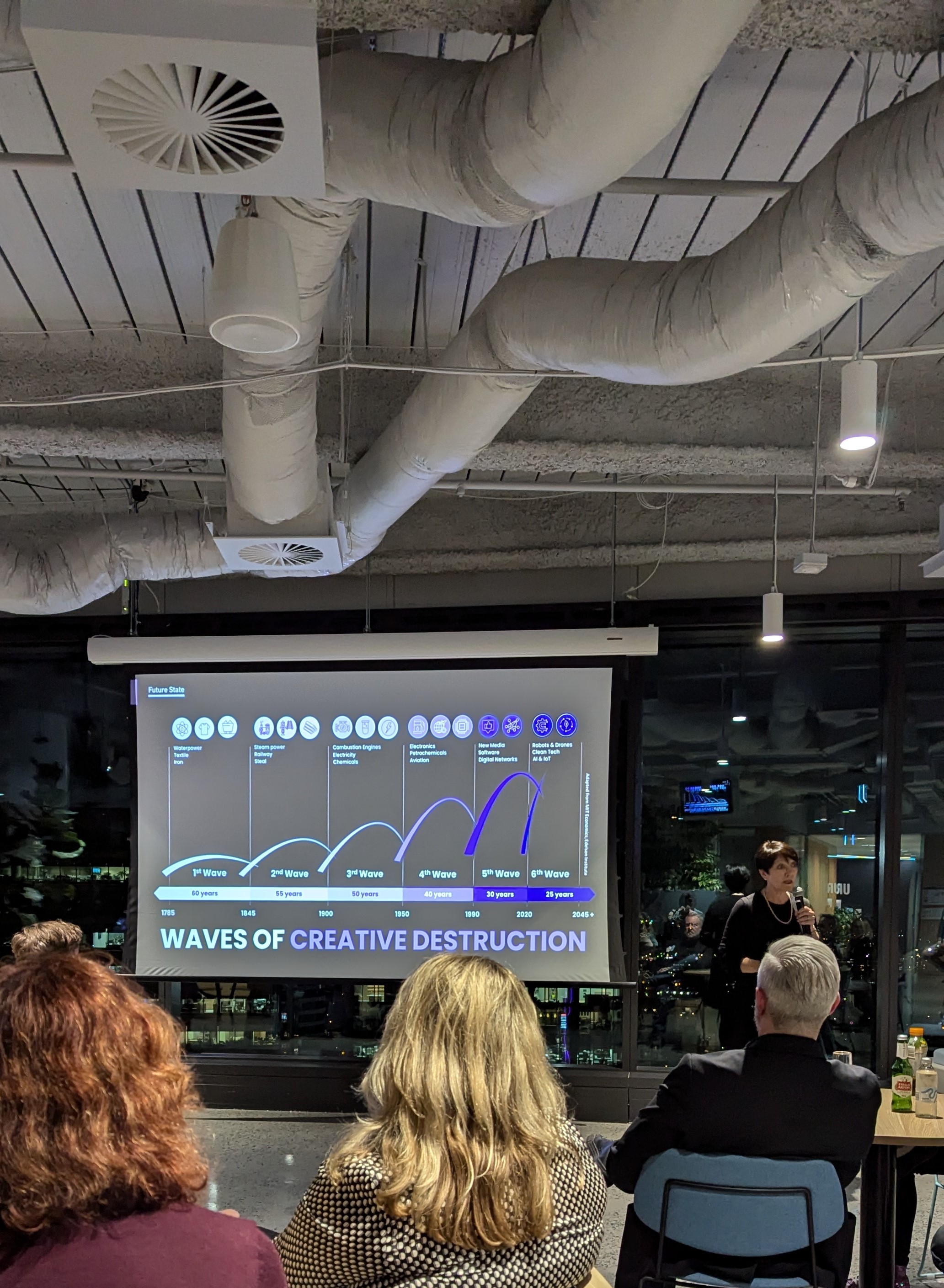 We started the evening with Kate Meyrick from Urbis who straight off the bat ran into some tech issues with her slides being out of order. She was a masterclass in how she dealt with this, and immediately put us in the headspace that technology can be unpredictable, but we as humans can run with whatever it gives us. It was an inspiring lesson in finding structure through chaos, and resilience in dealing with change. Kate spoke about the increasing pace of change that we all know about (for those of us like me who remember sending Architects Instructions via fax, where you might get an answer in 3 days, the change just within the last two decades to immediately expectations of communication is profound) and how it is beholden on us to embrace these changes, and be good ancestors through our choices. Cities and industries are not static museum-pieces – we need to have courage to imagine the type of future we want to create.