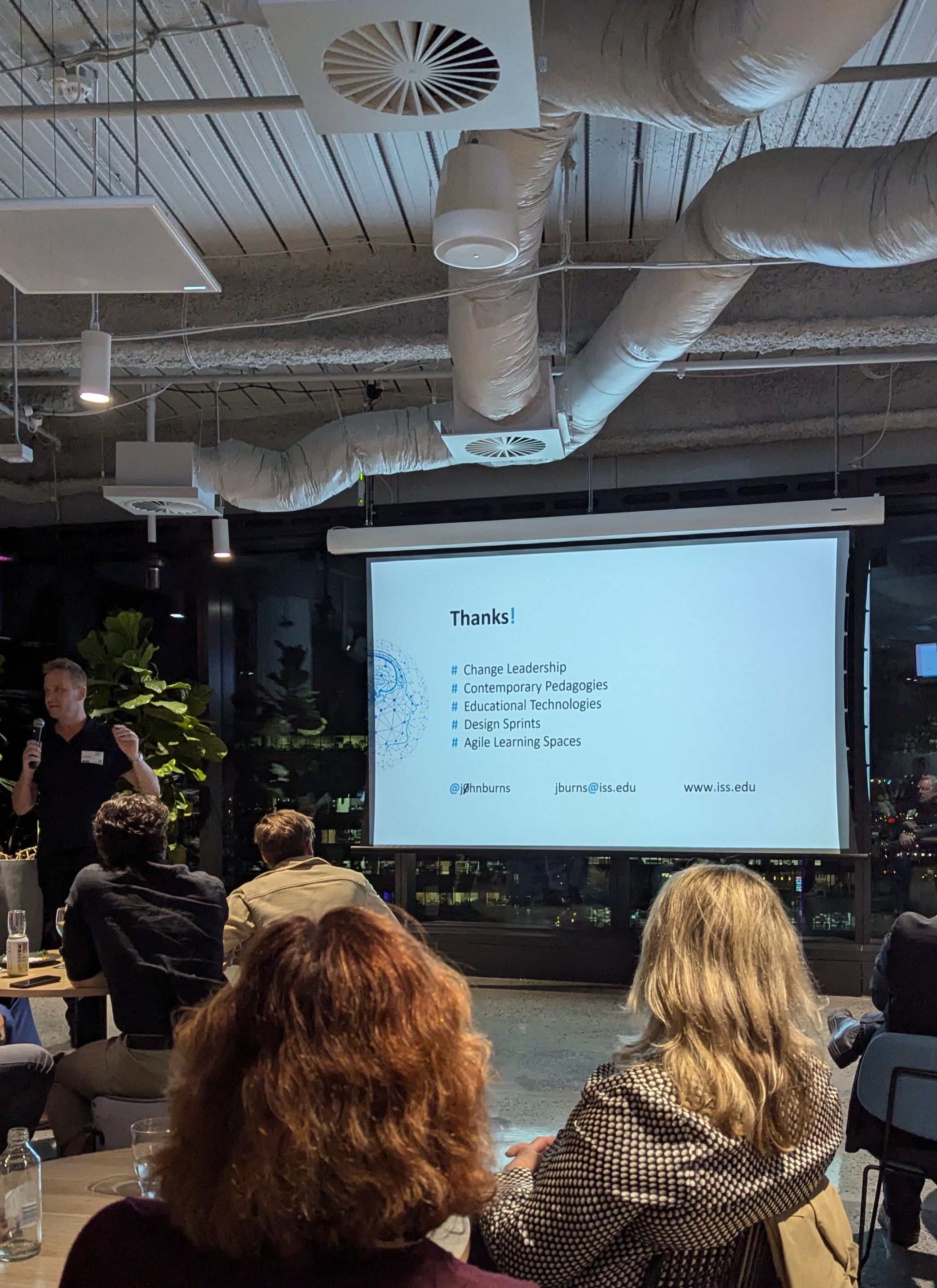 Next up we heard from John Burns, the Chief Executive Officer of International School Services, who was brave to try and fit audience participation time and a presentation into 6 minutes. Reflecting on his experience with students using AI for course work and assessments, he shared how we may need to more carefully consider what assessments mean, who they are or, and what their purpose is. I liked his thinking that using more automation and the technology available to us, we all may be able to claim more time to do the things we actually want to be doing. In his words “stay skeptical – stay aware”. We cannot avoid that AI is goign to impact us, so its important to remember those things that make us human, and hold on to nurturing them in our students.