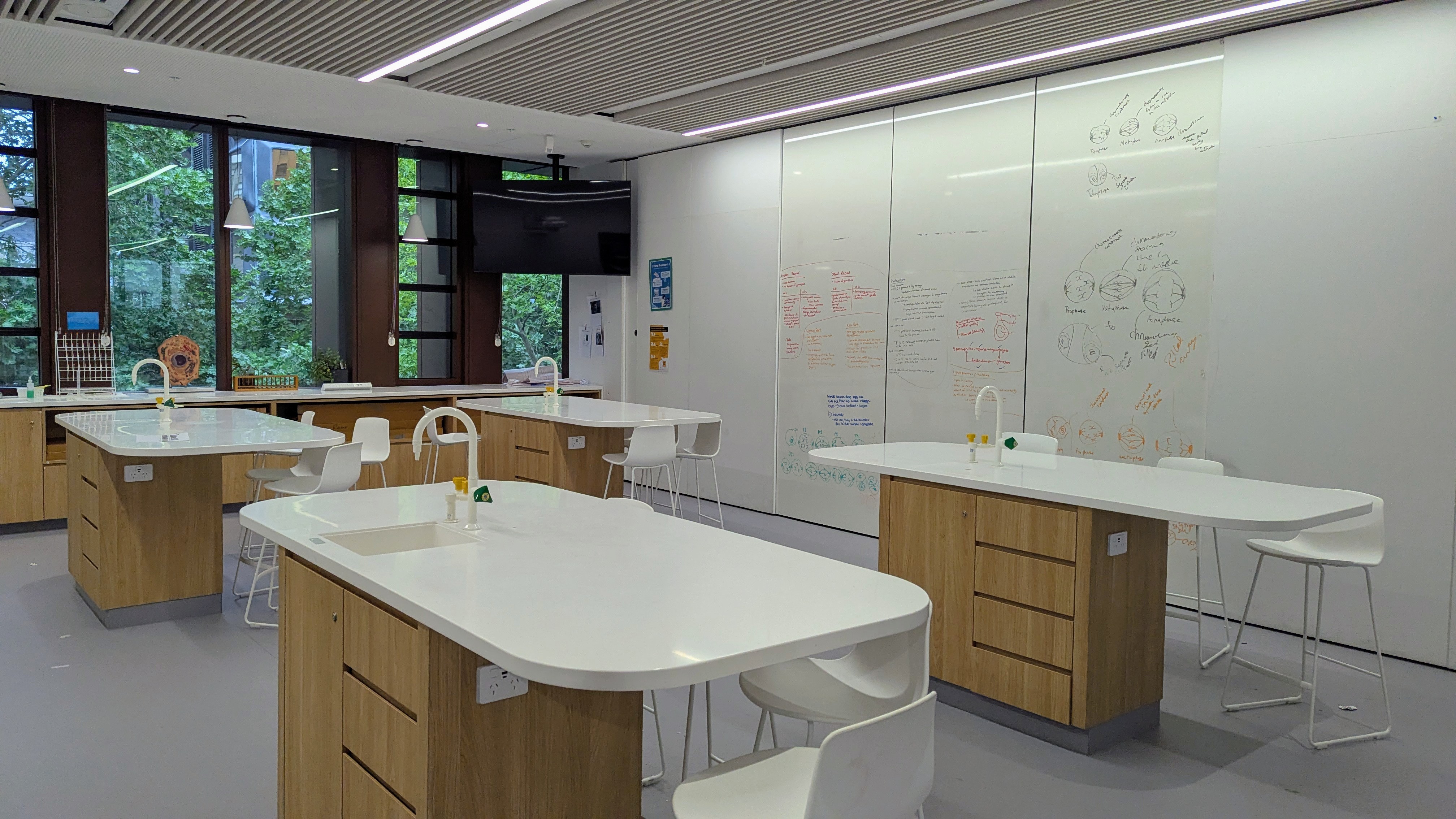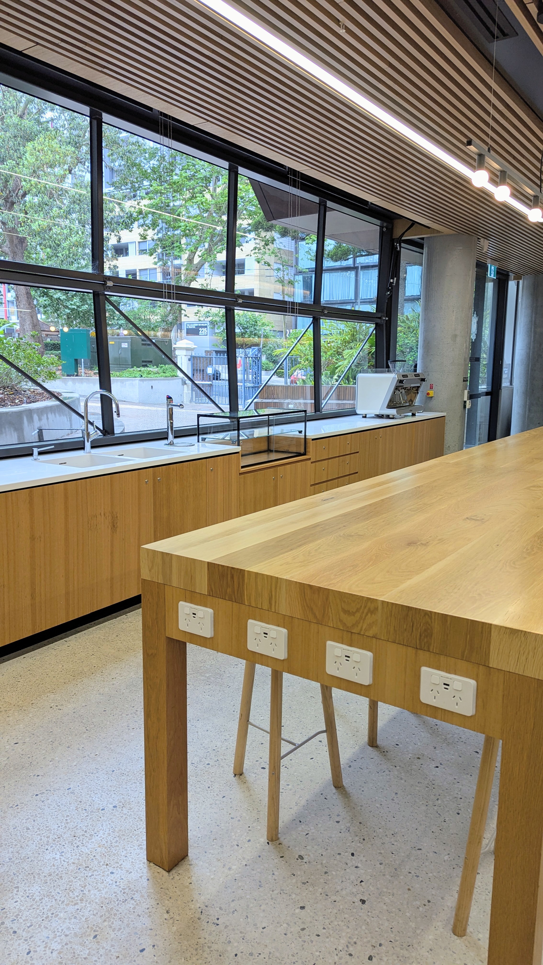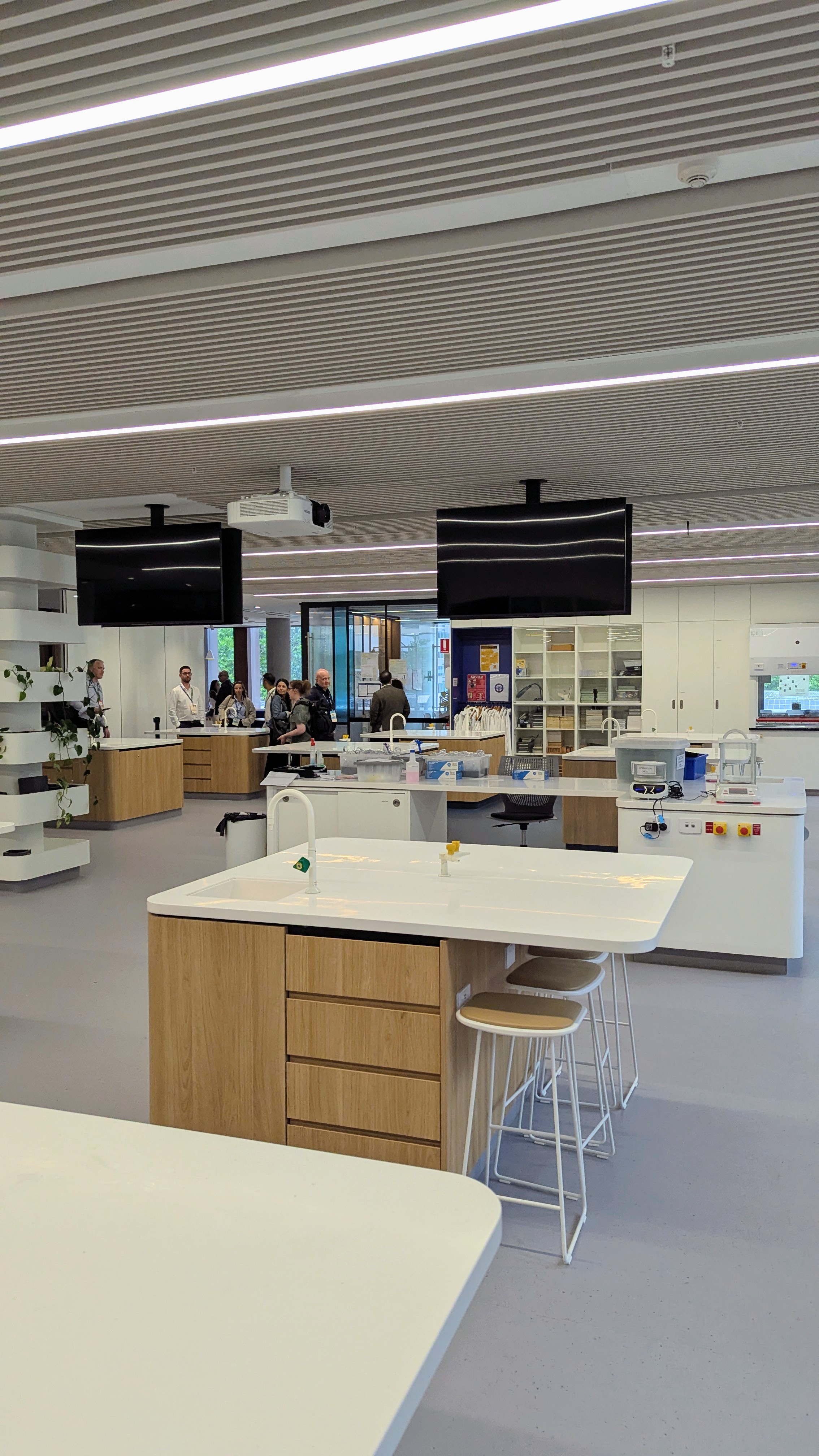 The science labs on the upper floor were a really interesting design, with a pair of semicircular labs each opening up to various sized theory spaces either side. Each of the four theory labs on this floor are differently sized and break out to a curved walkway which is set back to bring in the sun to the pool beneath. Across the central outdoor spine connecting the entrance on Miller Street with the rest of the campus, is the Hospitality kitchen with large tilt doors out to an open paved terrace. This bringing together of science and hospitality and enquiry along the public lane reminded me of a town square, celebrating learning and bringing together diverse views.