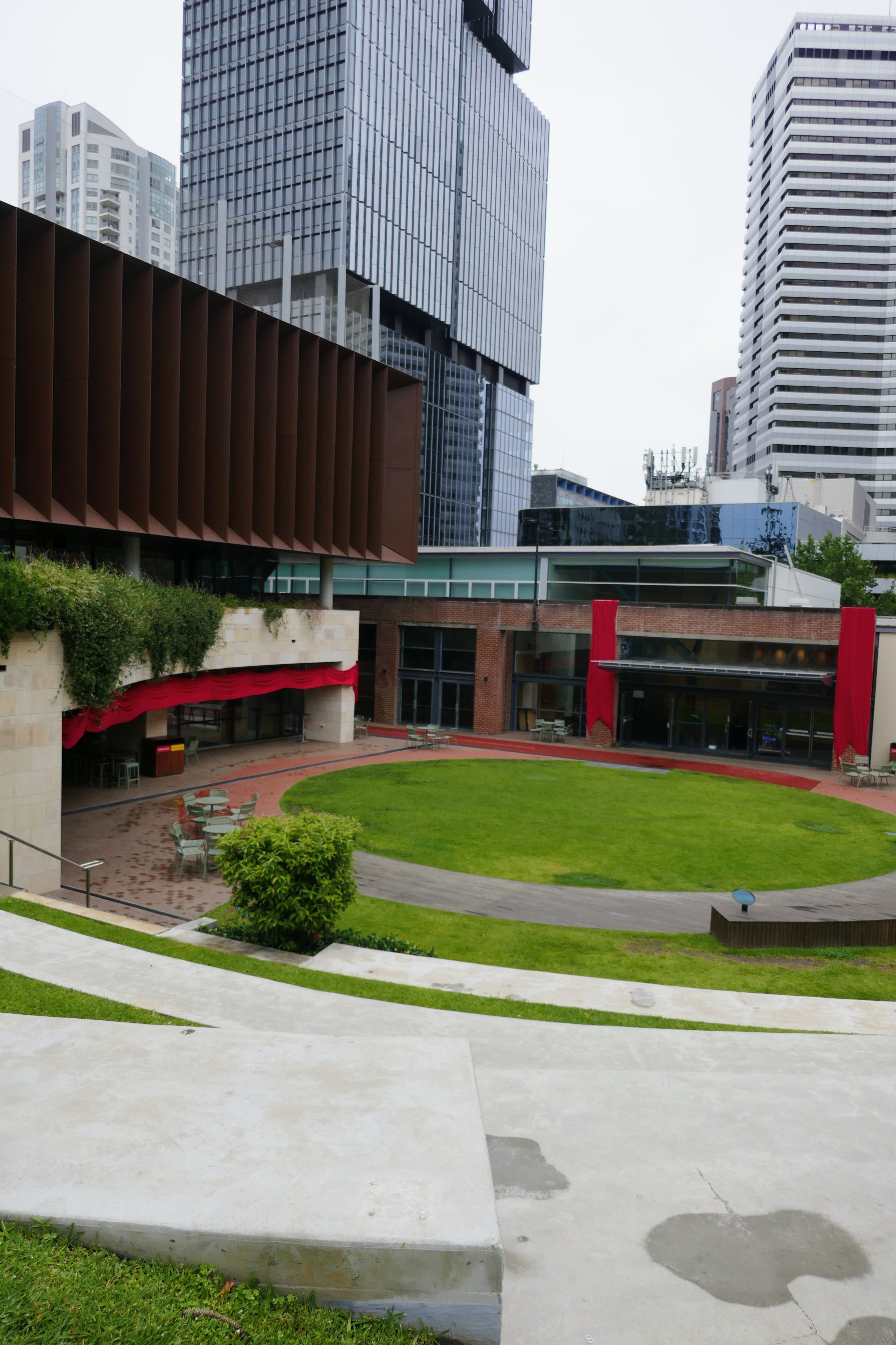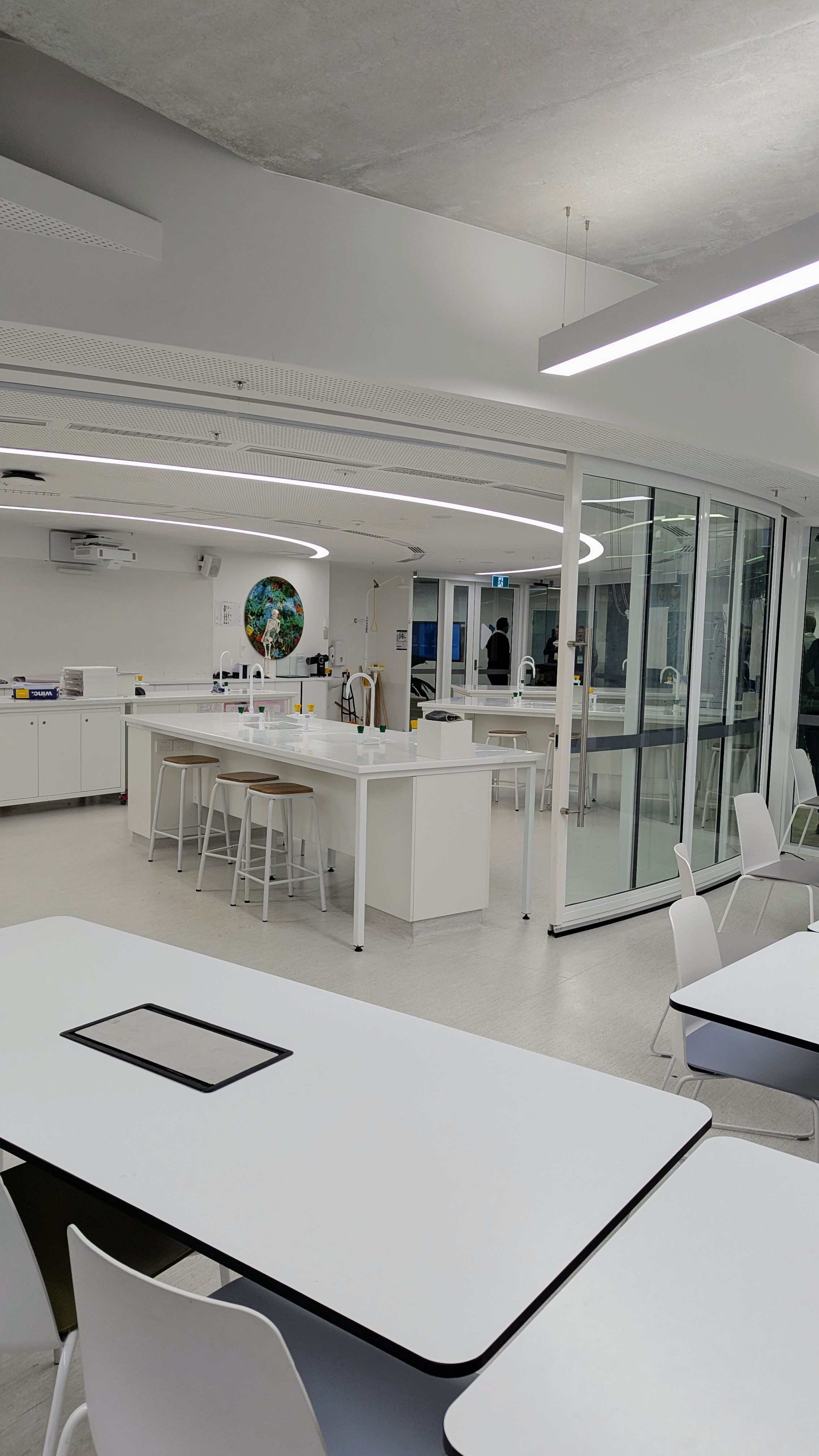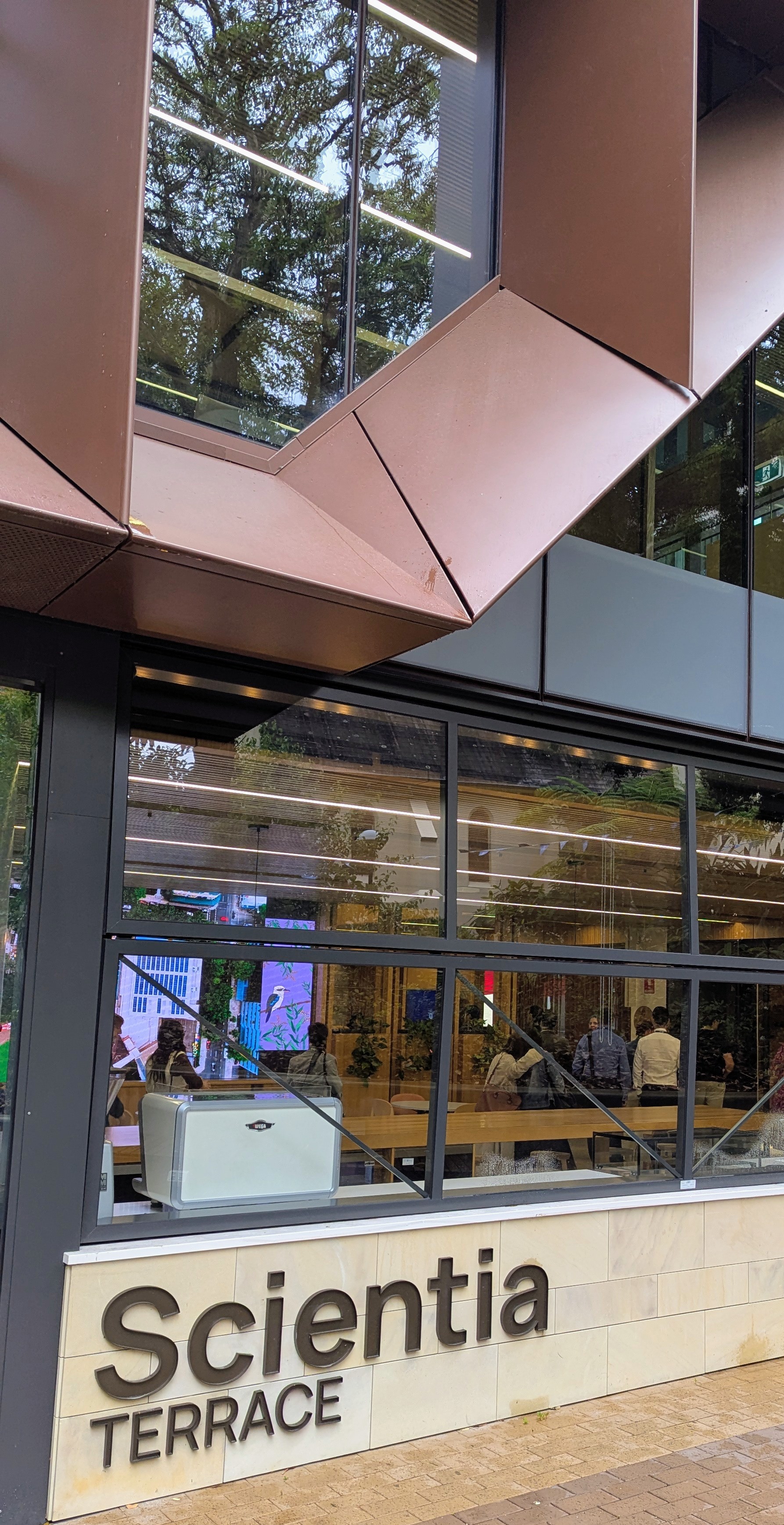 The science labs on the upper floor were a really interesting design, with a pair of semicircular labs each opening up to various sized theory spaces either side. Each of the four theory labs on this floor are differently sized and break out to a curved walkway which is set back to bring in the sun to the pool beneath. Across the central outdoor spine connecting the entrance on Miller Street with the rest of the campus, is the Hospitality kitchen with large tilt doors out to an open paved terrace. This bringing together of science and hospitality and enquiry along the public lane reminded me of a town square, celebrating learning and bringing together diverse views.