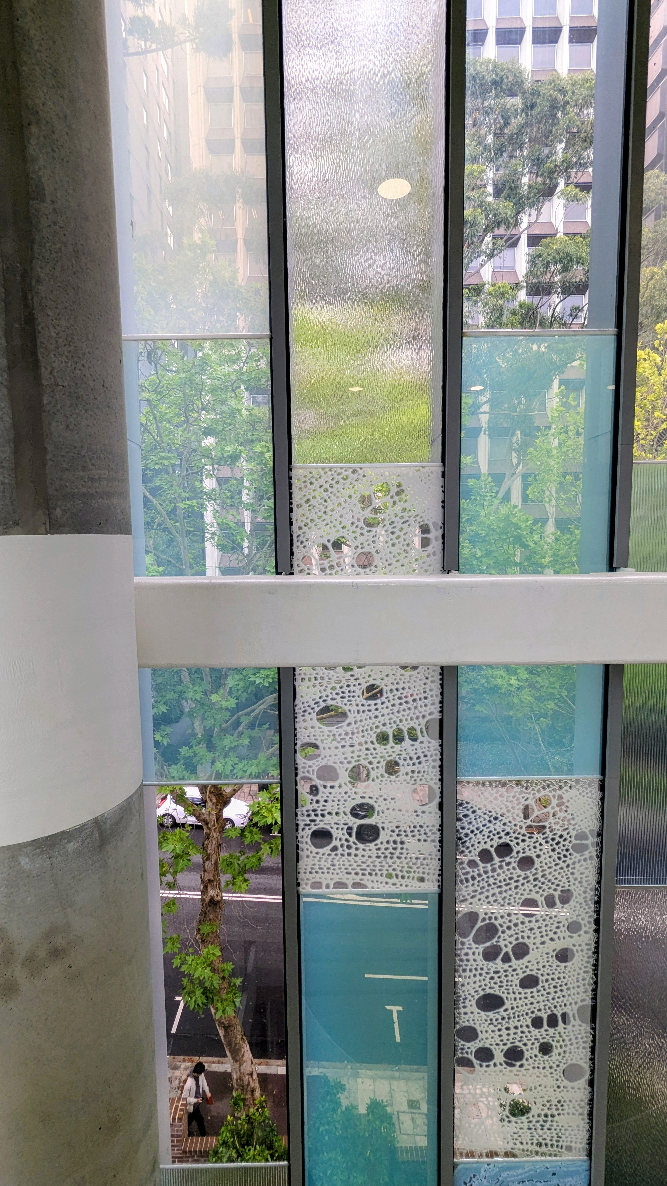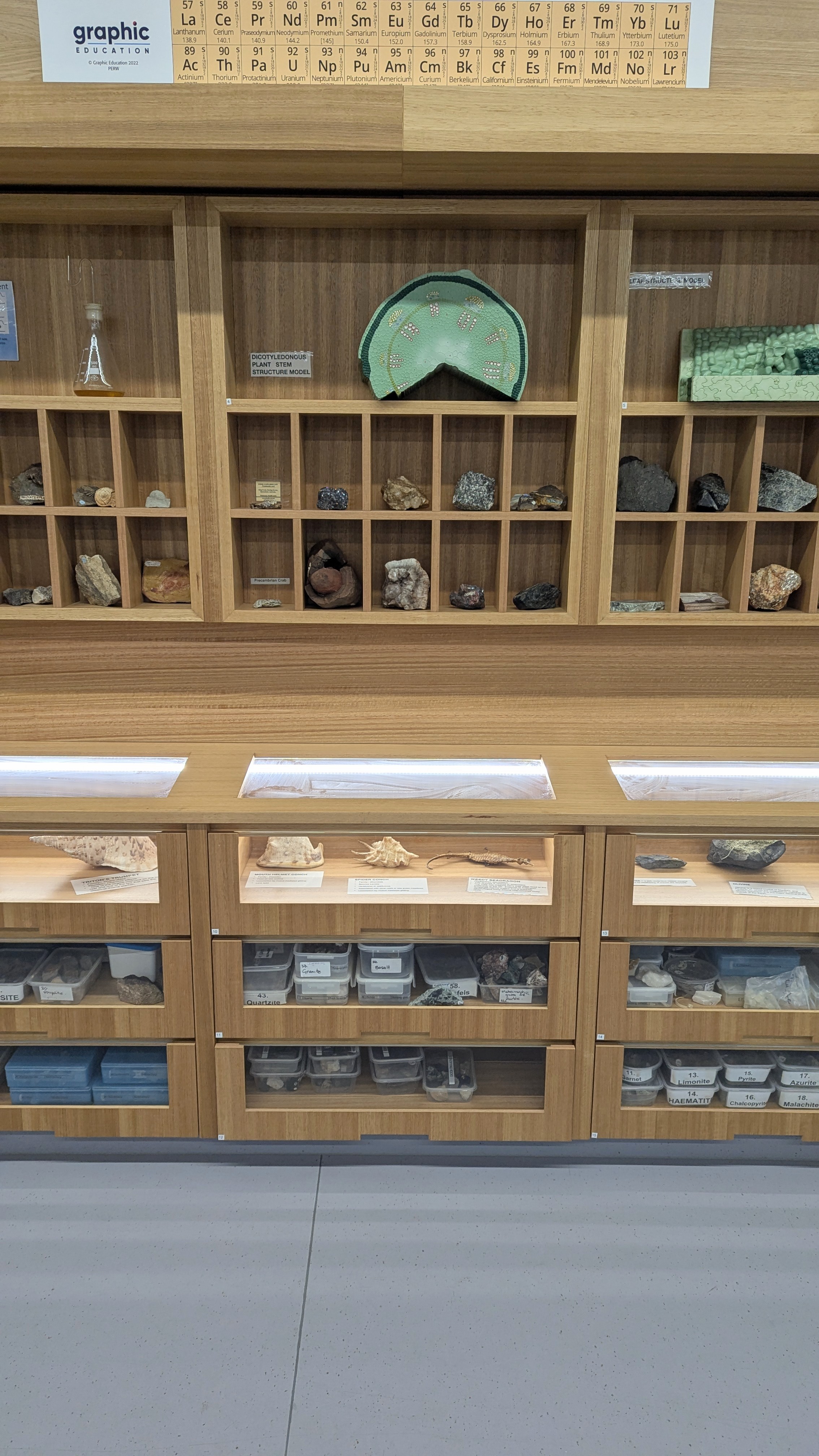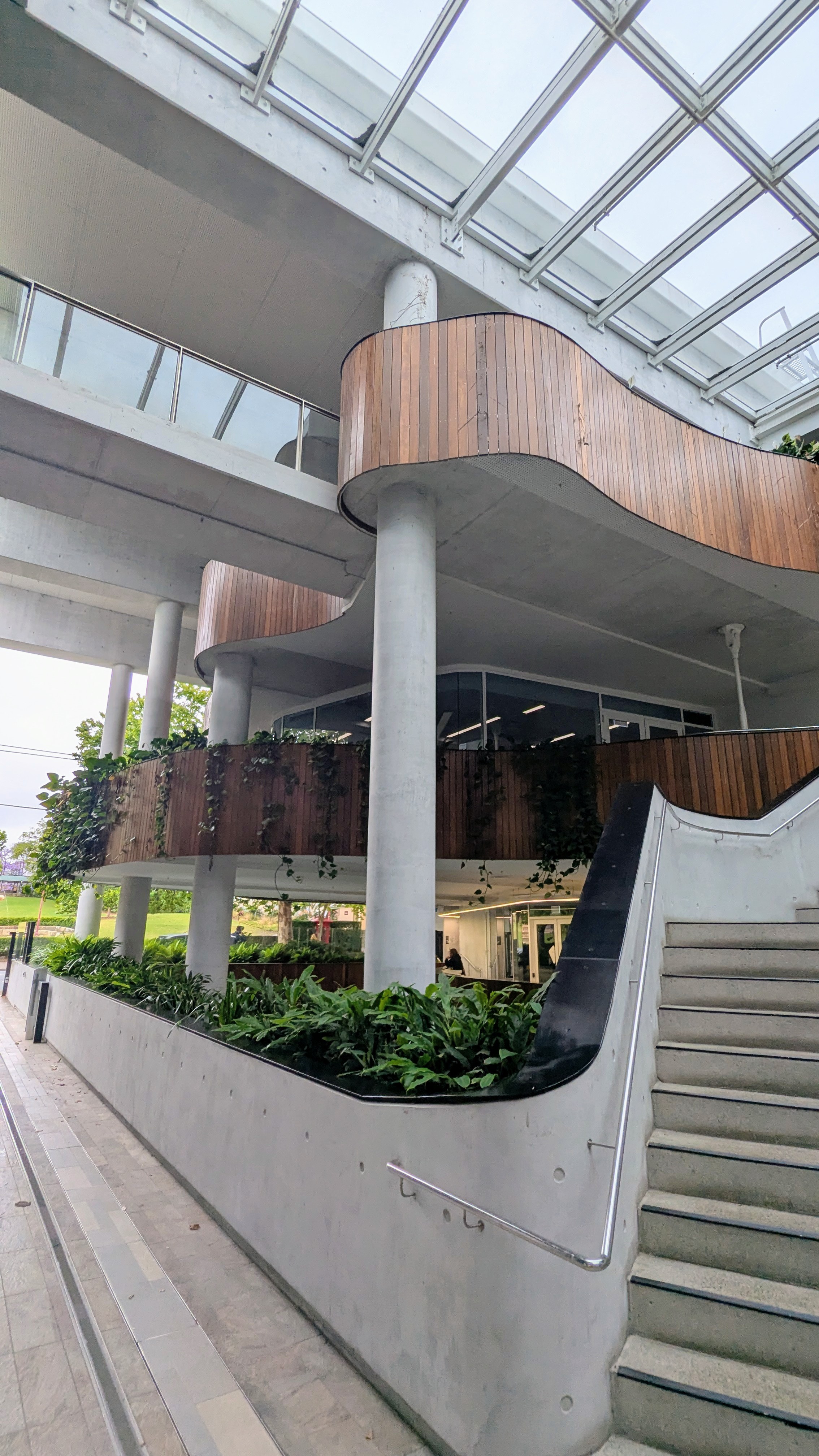 The two science levels had a mixture of theory spaces and prac spaces, on either side of a wide transition space, with different configurations possible for different kinds of work. The large windows to each room at treetop level enhanced the sense of light across the rooms, and although we were there on a slightly rainy dreary day, the connection to the outdoors was fantastic. There was a lot to like about this building and the opportunities for learning and growth you can imagine it brings about.