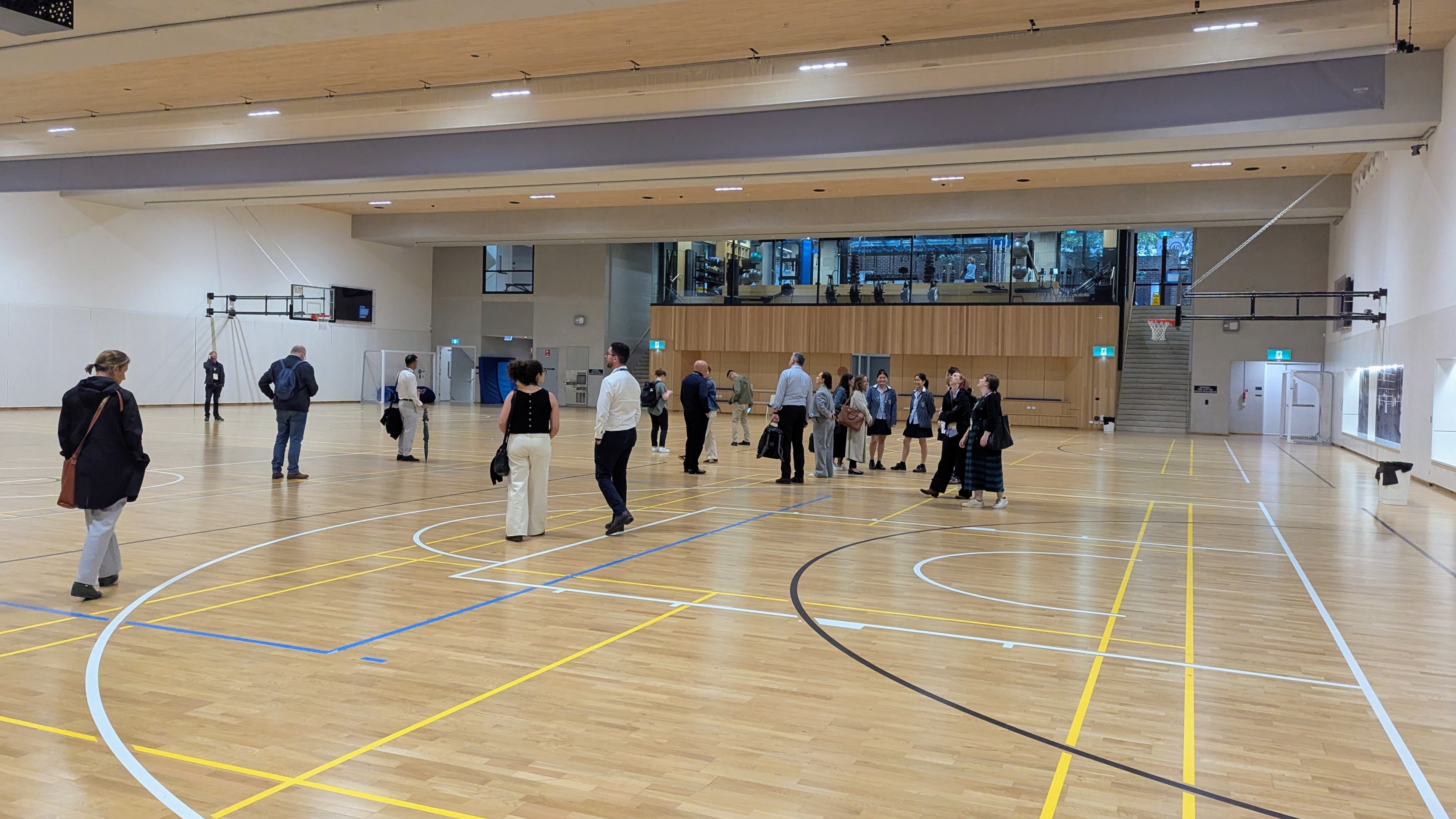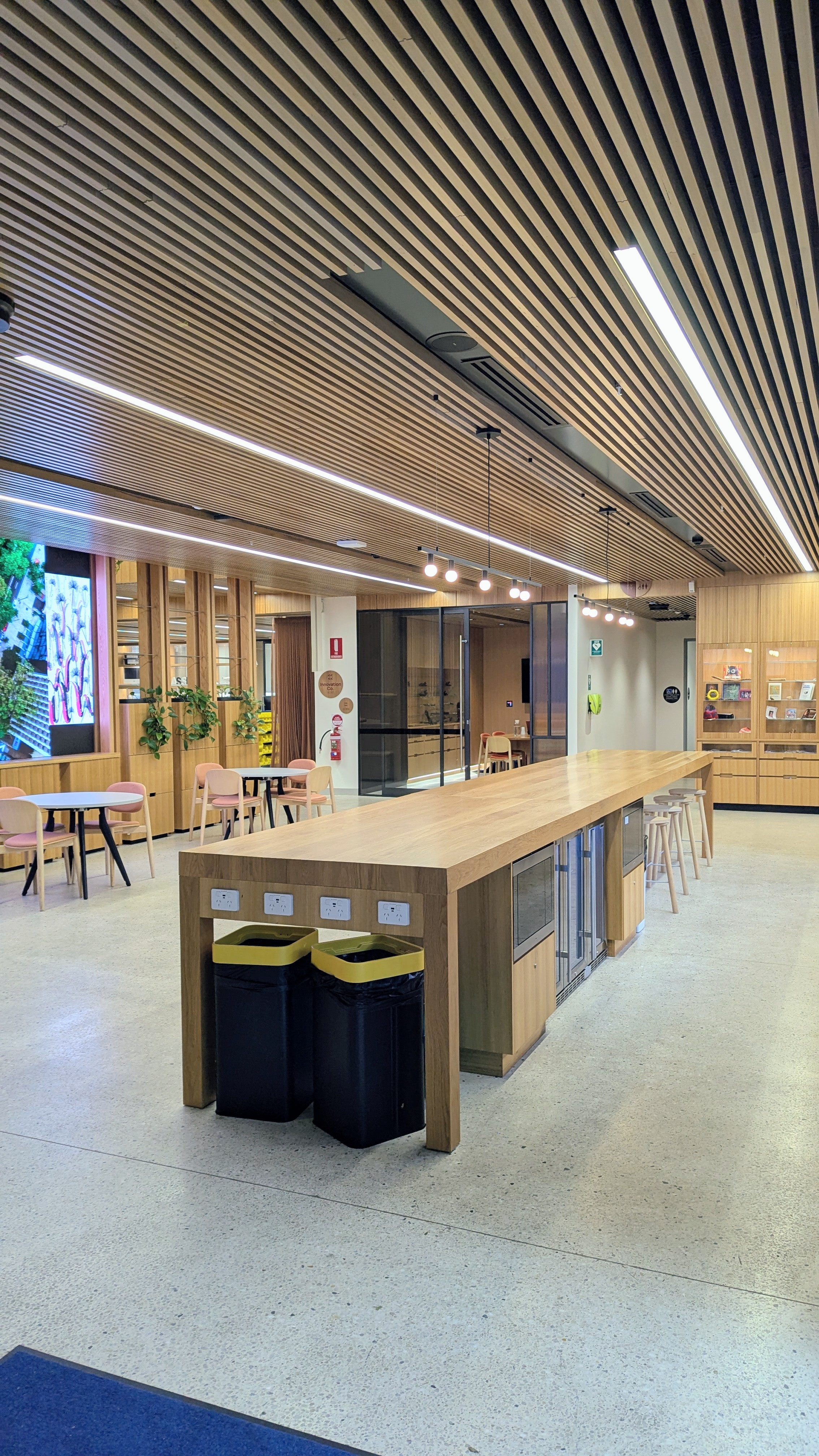 Between the two sports decks sat a number of flexible and innovative learning spaces, with the entry level dedicated to innovation, making, display, presentation and experimentation. While we were touring the space, and during our networking session after, the makerspace was in full use by students, creating and learning individually and with a staff mentor as needed, while the presentation space immediately outside was comfortable and seamlessly tech-driven while also being adaptable. Easily amused as we are, a lot of the architects were fascinated by the moveable TV screen joinery panel between these spaces – such a clever idea to not let electronics dictate fixed spaces.
